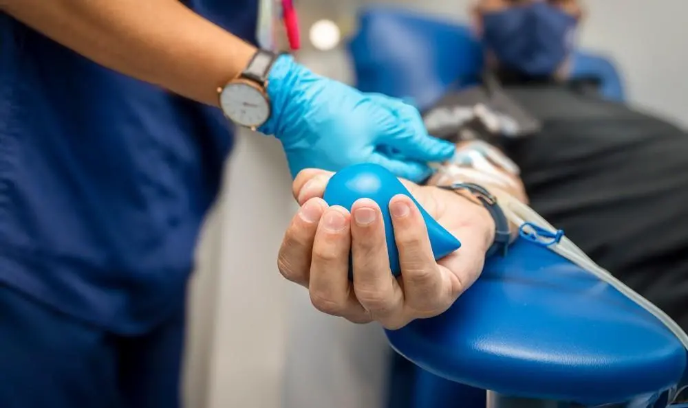 ▲一名男子在献血时手持挤压球 资料图 图据图虫创意
