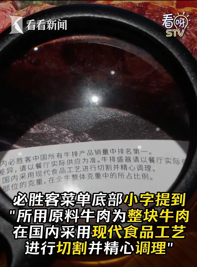据上海广播电视台报道,记者随机挑选了两家必胜客线下餐厅,点了菜单上价格从59到85元不等的多款牛排。端上来的牛排,看起来与菜单上的确实有差别,口感也不像原切牛肉。当记者提出疑问时,两家店员给出了截然不同的回答。
