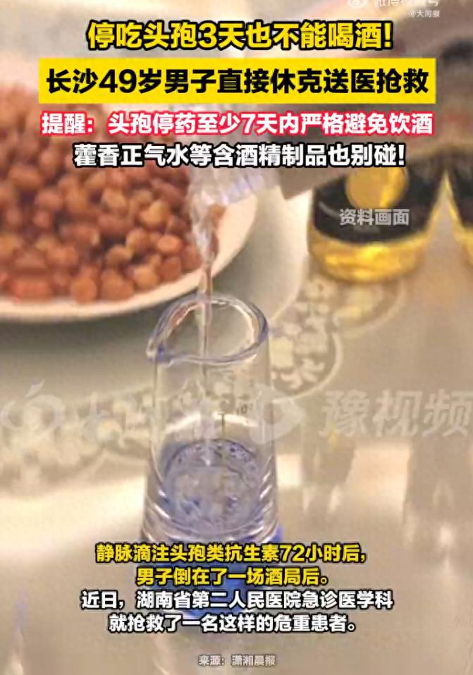 近日,湖南长沙。49岁的李先生(化名)因感冒,在社区医院连续静脉滴注了几天头孢类抗生素。病情好转后,他严格计算了时间:在停药整整72小时后,自觉药物应已代谢干净,便在一次晚宴中饮用了白酒。然而,酒局结束后不久,危险悄然而至:剧烈的头晕、心悸、全身皮肤潮红、眼前发黑、胸闷憋气,被紧急送医。