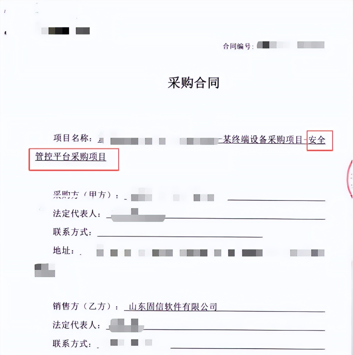 图片来源:安固销售人员提供的某理工科院校的采购合同扫描件 而为了证明“总公司”的实力,销售人员还发来多份固信的销售合同扫描件,其中一份合同的采购方显示为国内大型知名IT服务商,合同信息显示,该公司采购的软件为“安全管控平台”。