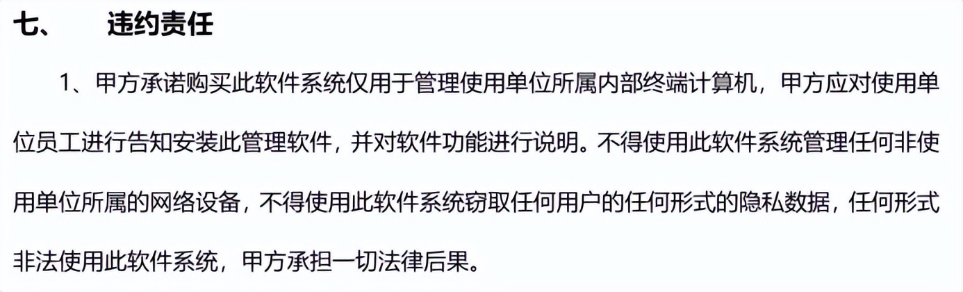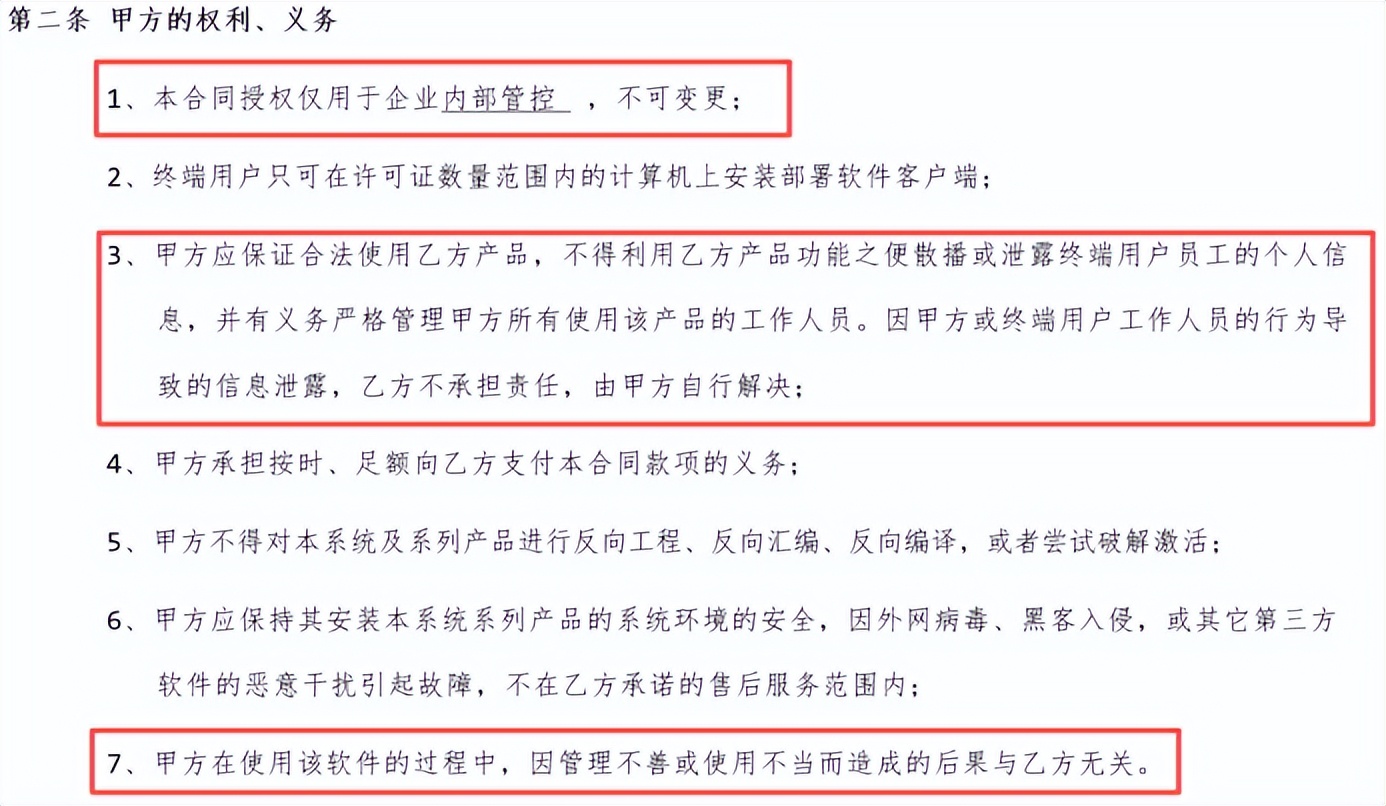 图片来源:安固销售人员提供的某科技公司与固信的采购合同扫描件 这些客户均购买了记者测试的这款软件吗? 销售人员称,网关属于不同的功能,是可以单独购买的,宣传材料中列示的公司客户并非全部购买了监控功能。 调查过程中,记者发现,两家公司的合同范本均对采购方的权利义务及安全责任做出规定。