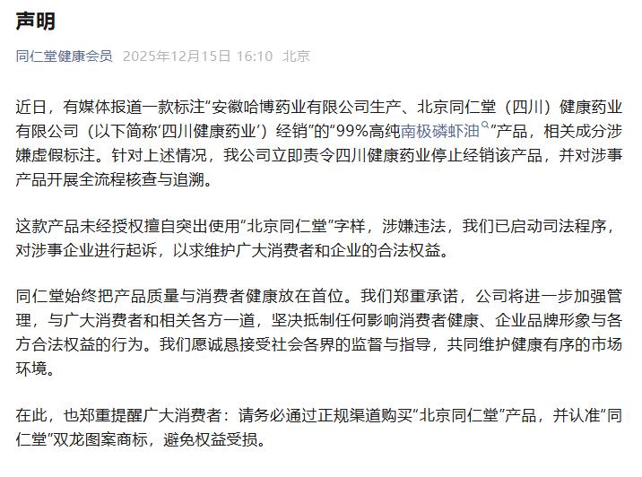 12月25日,中国北京同仁堂(集团)有限责任公司发文透露近期核查整改工作。 一、严肃问责追责,强化责任落实 全面核查涉事单位及人员失职失责问题。经查,同仁堂集团对四川健康“同仁堂”字号及商标授权已于2021年3月21日到期,未再授权。事件发生后,同仁堂集团、健康药业在问责调查的同时,成立由集团高管带队的工作组全面接管四川健康公司经营管理工作,责令李声义辞去四川健康公司总经理职务,并对其他相关管理人员全部予以停职。后续将根据政府监管部门及内部调查结论,对相关失职失责人员严肃处理。 二、全力配合监管,推进调查处置 同仁堂集团驻四川工作组主动对接,积极配合四川省、成都市、新都区三级联合调查组的立案调查工作,已提交了四川健康侵权行为相关佐证文件。同仁堂集团持续推动四川健康产品下架、召回涉事产品,向各大电商平台发声明函,每日监测并推动联动清理,阻断涉事产品流通渠道。 三、公布正规产品信息查询系统,引导消费者认准“同仁堂”双龙标 针对消费者反映的产品辨伪问题郑重提示:正规“同仁堂”品牌产品,清晰印制“双龙标”,商标也作为官方授权店铺的统一标识;12月23日,同仁堂集团产品查询系统已在官网上线,开放1000余条涵盖中成药、保健食品等品类产品的信息查询服务,提供权威购买指引。 四、开展品牌严管专项行动,全面清理违规乱象 同仁堂集团已启动品牌严管专项行动,对各级企业品牌使用情况开展拉网式核查,截至12月24日,累计排查所属单位/店铺520余次。 自品牌严管专项行动以来,对重点电商平台上侵权产品和店铺链接进行排查,累计完成侵权产品投诉近600项;对“同仁堂正品直售”“北京同仁堂滋补佳品”等120余个冒用同仁堂名义的违规店铺发起投诉,坚决打击“擦边”使用“同仁堂”字号、商标使用不规范等行为。 此前报道: 据上海消保委微信公众号,一款标称“北京同仁堂99%高纯南极磷虾油”的产品,在网页上写着“高含量”“智利进口原料”“高度提纯”“1粒≈100只磷虾”,其磷脂标识值为43%,看似是品质出众的优质产品,但检测结果显示该款产品磷脂含量为0。  涉事产品外包装上刻意突出了“北京同仁堂” 日前,上海市消保委公众号发布文章称,已经约谈疑似造假的南极磷虾油生产商,背后涉及知名企业、老字号品牌“同仁堂”。 12月15日,北京同仁堂健康药业股份有限公司发布声明: 近日,有媒体报道一款标注“安徽哈博药业有限公司生产、北京同仁堂(四川)健康药业有限公司(以下简称‘四川健康药业’)经销”的“99%高纯南极磷虾油”产品,相关成分涉嫌虚假标注。针对上述情况,我公司立即责令四川健康药业停止经销该产品,并对涉事产品开展全流程核查与追溯。 这款产品未经授权擅自突出使用“北京同仁堂”字样,涉嫌违法,我们已启动司法程序,对涉事企业进行起诉,以求维护广大消费者和企业的合法权益。  12月15日下午,上海市消保委针对北京同仁堂南极磷虾油产品的相关问题,正式约谈了该产品的经销商与生产商。生产商安徽哈博药业有限公司陈述,涉事产品由经销商北京同仁堂(四川)健康药业有限公司定制采购,采购价格远低于正常水平,产品包装按照北京同仁堂(四川)健康药业有限公司要求制作,所有涉事产品均供给北京同仁堂(四川)健康药业有限公司,由其对外销售。安徽哈博药业有限公司承认,在生产过程中未添加其对外宣称的 “南极磷虾油”。经销商北京同仁堂(四川)健康药业有限公司在约谈中回避问题推脱责任,声称对产品的涉嫌造假行为毫不知情,与己无关。 12月20日,中国北京同仁堂官微发文回应“南极磷虾油造假”:高度重视、深感痛心,派工作组到四川一查到底。 针对近日有关“南极磷虾油”的舆论关注,北京同仁堂集团高度重视、深感痛心,对因此给消费者造成的权益损害,向广大消费者和社会各界致以最诚恳的歉意!同仁堂集团立即开展零容忍品牌严管专项行动,已采取如下措施: 一、派专项工作组到四川,对涉事产品开展全面深入核查,坚决一查到底。 二、责令并监督涉事经销主体四川健康立即下架涉事产品,严格按照监管部门要求依法依规对消费者进行赔偿。 三、依法追究四川健康、哈博药业及相关电商平台的商标侵权等责任。对其违法使用“北京同仁堂”字样,误导消费者判断,损害消费者合法权益的行为追究法律责任。 四、对四川健康及其控股股东健康药业等单位在经营、管理、监督环节存在的问题开展问责,严肃追究相关人员责任。 为进一步保护消费者权益,强化品牌保护责任,同仁堂集团同时开展以下工作: 一、全面排查品牌使用中的违法违规行为,对集团各级企业的品牌使用情况进行拉网式核查。 二、全面开展品牌清理行动,坚决清理“擦边”使用“同仁堂”字号、商标使用不规范等行为,严格规范品牌管理体系。 三、全面规范电商平台授权店铺标识,严格使用“同仁堂”双龙图案商标,主动引导消费者准确识别正规购买渠道。 “同仁堂”品牌创立356年来,始终离不开广大消费者的支持和厚爱。我们心怀感恩,诚恳接受社会各界的监督与批评,愿意与大家一道,共同守护好“同仁堂”金字招牌,以实际行动维护“同仁堂”的品牌信誉,不辜负消费者的信任与期待。 中国北京同仁堂(集团)有限责任公司 2025年12月20日 市场监管总