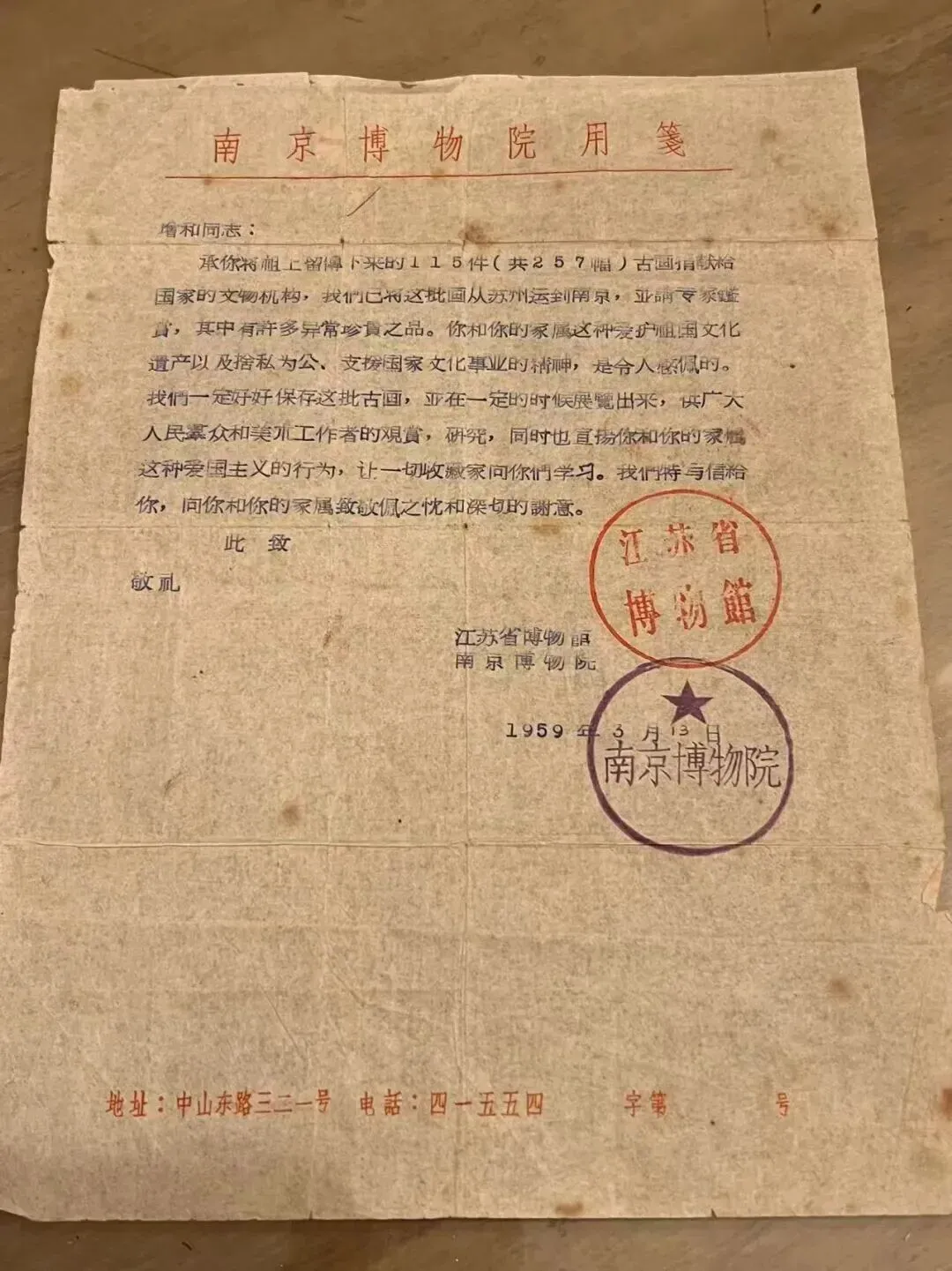 南京博物院时任院长曾昭燏执笔给庞增和写的感谢信。 图源:财新 此外,相关画作的接收时间系1959年,专家组的鉴定时间为1961年。显而易见,“接收”与“专家组鉴定”的时间间隔非常靠近。换言之,既然刚刚接收该画作,即被专家组认定为“赝品”,那么南博基于何种原因继续保留“赝品”,而非退还捐赠者? 1999年生效的《中华人民共和国公益事业捐赠法》(以下简称“《公益事业捐赠法》”)第五条规定:“捐赠财产的使用应当尊重捐赠人的意愿,符合公益目的,不得将捐赠财产挪作他用。”该法第十八条规定:“受赠人与捐赠人订立了捐赠协议的,应当按照协议约定的用途使用捐赠财产,不得擅自改变捐赠财产的用途。如果确需改变用途的,应当征得捐赠人的同意。” 南博接收捐赠品的时间在《公益事业捐赠法》生效之前,因此我们不能苛求南博必然与捐赠者签署(或补签)捐赠协议。但是,南博处置相关画作的时间恰好在《公益事业捐赠法》生效之际,文物店售卖画作的时间点更是晚于《公益事业捐赠法》生效时间。在《公益事业捐赠法》已生效的前提之下,南博未征求捐赠人的意见即划拨捐赠品,文物店又在捐赠者不知情的情况之下直接售卖捐赠品。南博与文物店的行为,显有不当。 令人忧虑的是,二者为何踩着《公益事业捐赠法》生效的时间点处置相关画作?(《国有馆藏文物退出管理暂行办法》于2018年生效,距离文物店售卖捐赠品的时间较远,因此本文暂不讨论该办法。) 疑问四:南博和文物店何以一卖了之? 文物鉴定,向存争议;笔者作为法律行业人士,不便施予评价。那么我们退一步,假定相关画作确系赝品,江苏文化行政部门以及文物店为何放任赝品流通于世? 南博在回应中称,画作处置系依据《博物馆藏品管理办法》。 可是,该办法第二十一条规定:“已进馆的文物、标本中,经鉴定不够入藏标准的,或已入藏的文物、标本中经再次鉴定,确认不够入藏标准、无保存价值的,应另行建立专库存放,谨慎处理。必须处理的,由本单位的学术委员会或社会上的有关专家复核审议后分门别类造具处理品清单,报主管文物行政部门批准后,妥善处理。” 这里的问题是,南博出于何种原因而未依法对相关画作进行“专库存放”?又是出于何种“必须处理”的事由而将画作划拨文物店? 再有,史学家陈寅恪曾言:“盖伪材料亦有时与真材料同一可贵。如某种伪材料,若迳认为其所依托之时代及作者之真产物,固不可也。但能考出其作伪时代及作者,即据以说明此时代及作者之思想,则变为一真材料矣。”据此,即便我们假定相关画作确系赝品,然考虑到画作之上承载着历代藏家的手笔和印章,显具重大研究价值。南博和文物店何以一卖了之?此种处置行为是否符合《博物馆藏品管理办法》所规定的“谨慎处理”和“妥善处理”? 疑问五:利益输送之嫌 作为文化事业机构的南博,将馆藏品划拨给下属的经营机构。 据媒体梳理,同意划拨相关画作的签字人徐湖平,时任南京博物院副院长,同时兼任文物店法定代表人。即相关画作没离开“如来的手掌心”,性质就由馆藏品变成了商品。 另据《沉痛哀悼陆挺先生:一位为收藏事业献身死而有憾的才子》一文显示,执笔人为徐湖平。还有,徐湖平曾为江苏省收藏家协会创始会长,而陆挺则是江苏省收藏家协会的顾问。