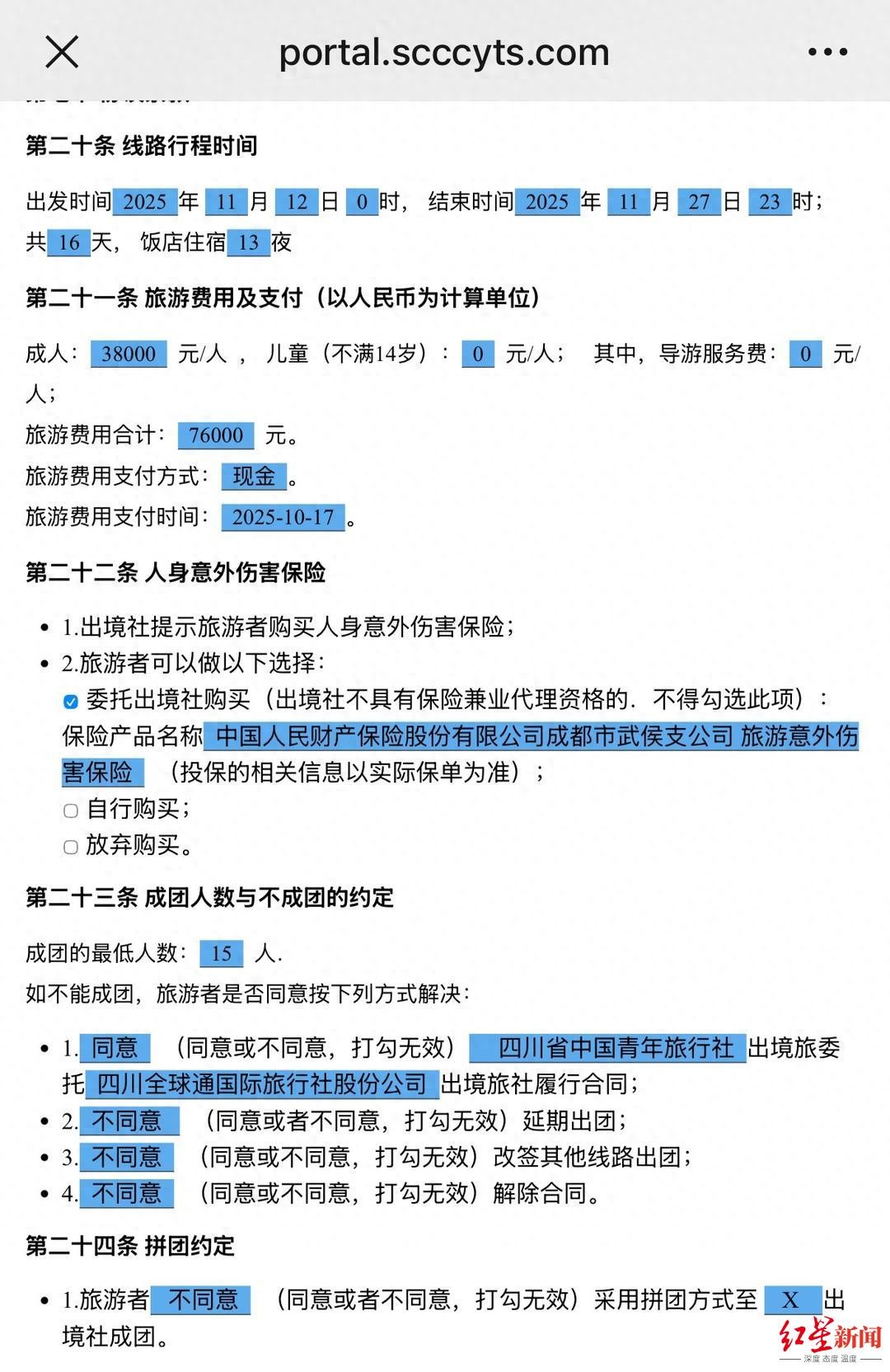 航班变动导致后续行程“缩水” 据悉,夏先生等人最初在四川省中国青年旅行社(以下简称:青年旅行社)报名此次行程,每人团费38000元。后因成团人数原因,行程实际由四川全球通国际旅行社(下称“全球通旅行社”)执行,该社为夏先生一行购买了旅游保险。  夏先生等人与四川省中国青年旅行社签订的合同 前期行程进展顺利,但11月24日从新西兰皇后镇飞往澳大利亚悉尼的航班被取消,直接导致原定11月25日在悉尼的游览行程全部落空。夏先生表示,旅行社曾告知他们航空公司仅赔付每位游客200新西兰元(约合人民币800元),但夏先生表示:“当时好几个中国旅行团都是乘坐这个航班,而其他的中国旅行团告知,航空公司为每个旅客赔付了400澳元(约合人民币1800元)。”夏先生要求旅行社出具航空公司的赔付证明,但遭拒绝。直到12月26日,旅行社才向夏先生等人出具了航空公司的赔付证明。  航空公司出具的赔付证明 由于行程“缩水”,夏先生等人希望旅行社能依据保单中的“出行旅程取消或缩短保障”条款(每人保险金额2000元人民币/人),向保险公司申请理赔损失。夏先生表示,他们始终未收到完整的保单文件,不了解具体细则。“我们要求旅行社把全部的保险单给我们他们没提供,让旅行社出面与保险公司交涉索赔,并提供航班取消影响次日行程的书面证明,也被拒绝。”  夏先生收到的保单 旅行社未提供行程受影响的书面证明 11月23日,青年旅行社一名相关负责人向红星新闻记者表示,全球通旅行社已将相关材料提交保险公司,但保险公司认定未达到赔付标准,详情需联系全球通旅行社。全球通旅行社相关负责人则表示需了解情况后再回复,但后续记者多次拨打其电话未能接通。 11月26日,夏先生收到了全球通旅行社出具的一份《情况说明》,其中称:航班改到11月25日抵达悉尼,出海关后已经是下午,不能前往原定的景点,可退回车费10澳币/人,船票申请可退15澳币,所以可退客人25澳币。原定的酒店和午餐已第一时间申请,得到酒店和餐厅的回复是不可退。全球通旅行社表示,出团通知书中约定,行程运行中因航班延误或取消、天灾、战争、罢工、政府管控等非旅行社因素的影响,旅行社有权对行程等做出相应的调整,但增加的费用由旅游者承担。 全球通旅行社提供了航空公司关于因航班取消所产生的住宿费与餐食费赔偿的截图。截图内写有:请保留收据。作为参考,我们建议每间房200新西兰元,每人餐费为30新西兰元。但目前航空公司尚未完成审核批复,故相关款项暂时未能报销。在此期间,额外产生的住宿费和车费均由全球通旅行社先行垫付,未向旅客收取任何费用。 红星新闻记者注意到,该《情况说明》里有两张关于保险理赔的聊天记录。聊天记录显示:取消原因不属于行程取消,只是航班取消,但是保单没有承保航班取消。全球通旅行社称:保险公司无法理赔的沟通和说明我社一直在跟进,保险公司的不能赔付说明需要由保险公司走流程后出具。目前,全球通旅行社仅能退还每人交通费25澳元及30新西兰元(旅行社垫付),合计人民币240元/人,可随时退还。 夏先生对此处理结果表示不满:“我们认为保险公司的理由不能成立,需要全球通旅行社配合,提供保单原件和行程受影响的书面证明,以便自行维权。” 12月26日,红星新闻记者联系承保方中国人民财产保险股份有限公司。客服表示,将有专人联系处理。 律师:旅行社涉嫌侵犯游客知情权与索赔权 针对此事,法律专业人士发表了看法。河南泽槿律师事务所主任付建认为,保单中明确列有出行旅程取消或缩短保障,每人保险金额为2000元人民币,这是游客主张航班变动致行程损失的直接对应条款,航班变动属航空公司原因导致旅程缩短,使游客受到损失,应当需要赔偿。但是如果航司已对航班变动造成的损失进行赔付,且保单约定“第三方赔付后保险公司免赔/补差”,则保险公司拒赔可能符合条款,但需旅行社提供保险条款细则和航司赔付证明,证明已达到“免赔条件”。游客作为被保险人,有权查阅、获取保单条款、航司赔付证明、行程取消凭证等材料,旅行社作为投保人,有义务向被保险人提供这些文件,拒不提供则侵犯游客的知情权与索赔权。 同时,青年旅行社因未达约定人数不能出团,经游客书面同意后可以委托其他旅行社履行合同。虽然行程由全球通旅行社实际执行,青年旅行社与游客的合同关系并未解除,游客的合理诉求仍可以向青年旅行社主张,青年旅行社不能以实际执行方是其他公司为由推诿。 陕西恒达律师事务所高级合伙人、知名公益律师赵良善认为,游客与旅行社建立了旅游合同关系。旅行社在事件中存在未履约以及未告知的情况,均涉嫌违法。 赵良善表示,旅行社仅告知游客购买了保险,未提供保单全部内容,导致游客对保险保障范围的理解存在偏差,且无法自主核实索赔条件,侵害了游客的知情权及保险受益权。根据《最高人民法院关于审理旅游纠纷案件适用法律若干问题的规定》第八条,旅游经营者对旅游者负有告知、警示等义务,该义务延伸至保险索赔阶段。游客要求旅行社出具行程取消凭证、保险公司拒赔说明,均属于旅行社应履行的协助义务。 赵良善建议,针对本事件纠纷,游客可先行协商取证,明确要求旅行社履行有关义务,并就行程取消导致的损失进行协商赔偿。若协商无果,游客可向旅游
