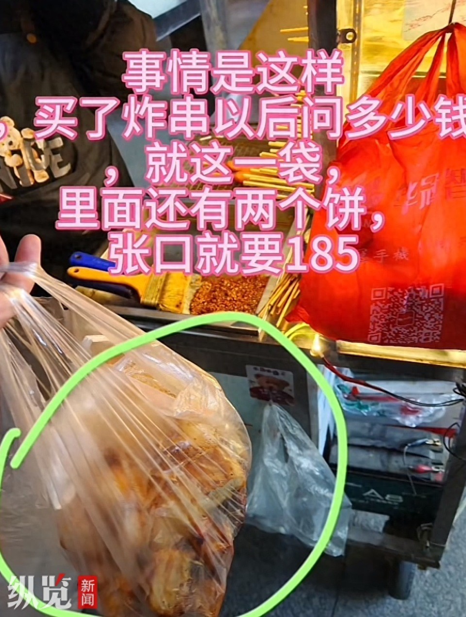 鸡翅、烤肠等20串炸串竟然要价185元?12月24日,潘先生向纵览新闻称,他在甘肃兰州火车站附近的流动烧烤摊遭遇了“炸串刺客”,20串炸串摊主要价185元,他当场打电话投诉后摊主又改口降价,经过一番争辩后支付了80元离开。潘先生将遭遇发到社交平台后,引发关注。兰州市城关区市场监督管理局团结新村市场监管所工作人员向纵览新闻表示,已关注到此事,将寻找涉事流动摊贩进行处理。 在视频中,潘先生讲述,12月22日晚,他在兰州火车站对面的流动烧烤摊购买了一些炸串,摊主炸完后要价185元。他认为价格有些太离谱,便要求摊主细数。视频显示,潘先生与摊主就价格问题产生争执,摊主在数炸串的数量,并称一串鸡翅20元、烤肠一根5元、茄盒一串10块。视频中,潘先生讲述,即便单价这么贵,但仍不够185元,于是拨打12345进行投诉,摊主改口称160元,后又说130元拿走,最后支付了80元后离开。不过,摊主改口降价的过程,视频中并未呈现。  网友发视频称购买20串炸串竟被要价185元。(来源/网络截图) 24日下午,潘先生向纵览新闻称,在购买前当时并未询问价格,他共买了两串鸡翅、小鸡柳、茄盒、鸡胗、韭菜、开花肠、撒尿牛丸、鱼豆腐、绿辣椒,还有三串金针菇,“以为也不会太贵,如果问了我肯定就不买了”。对于摊主改口降价160元,后又说130元拿走的过程,潘先生说当时并未拍摄到,“拍完视频后,争论到底多少钱的时候,才是(她改口)称130元的这个阶段,但确实没拍上。”潘先生还向记者发来了当时的支付截图,显示付款金额为80元,时间为12月22日22时58分。 12月24日,纵览新闻联系到事发地所属的兰州市城关区团结新村街道综合执法队,工作人员表示,确实接到了相关投诉,已经进行了答复,会针对该地区周边流动摊贩加大值守和整治力度。对于该网友所反映的价格问题,其表示,需联系当地市场监管部门处理。 兰州市城关区市场监督管理局团结新村市场监管所工作人员告诉记者,已关注到此事,将寻找涉事流动摊贩进行处理,并要求其将价格公示。 来源:纵览新闻