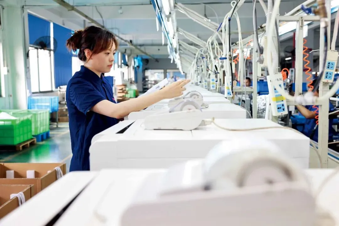 2023年6月7日,徐依在生产车间内检查成品质量。徐依曾留学于加拿大并获得生物医学工程硕士学位,完成学业回到家乡宁波,在一家医疗器械有限公司从事口腔医疗器械设备的研究与开发工作。图/新华