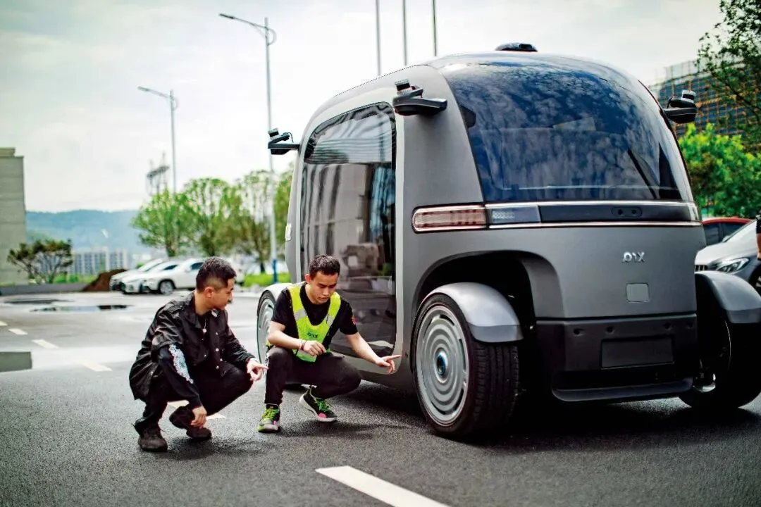 2023年6月14日,在贵阳市高新区生态科技产业园一家无人驾驶汽车企业内,就读于新加坡国立大学机器人专业的实习生李昂民荃(左)和同事张军文一起调试车辆。图/新华