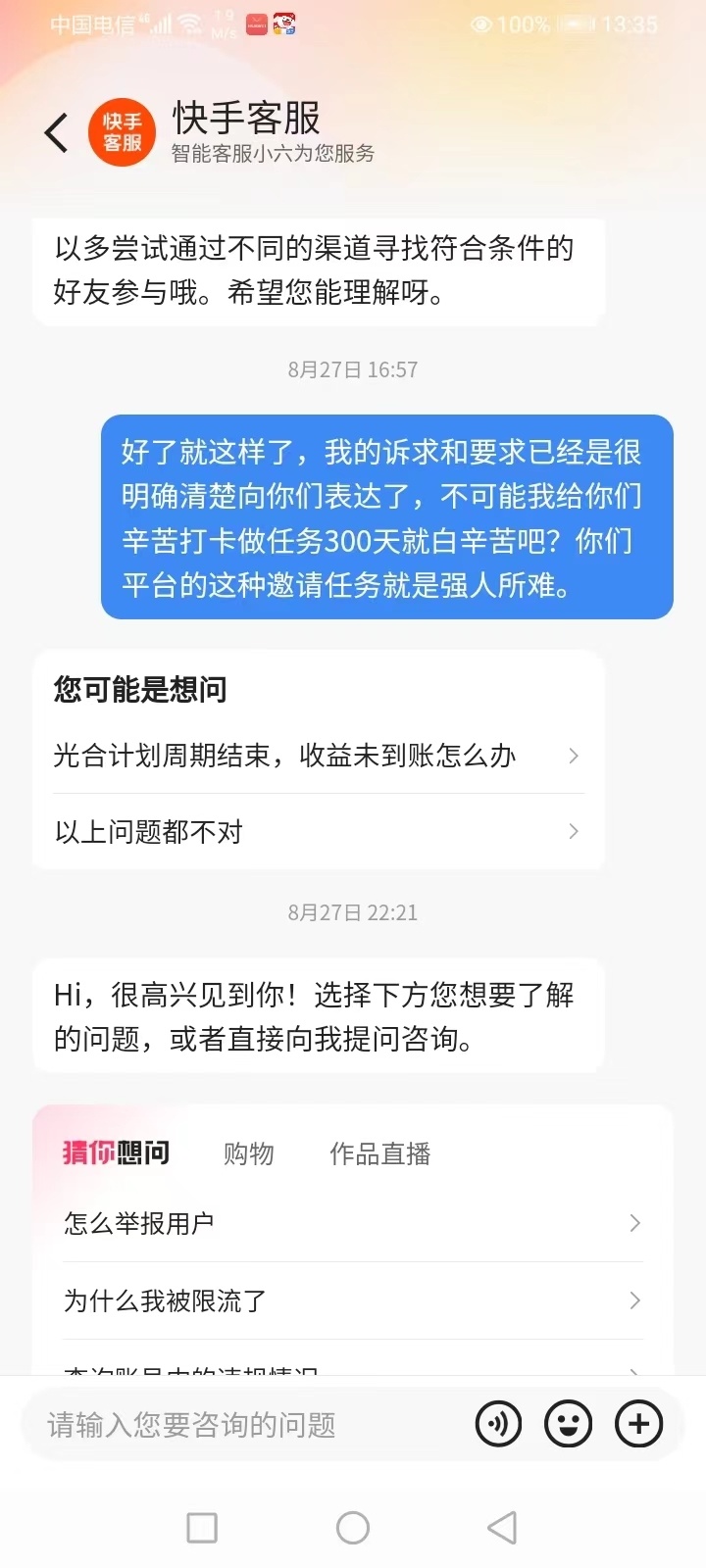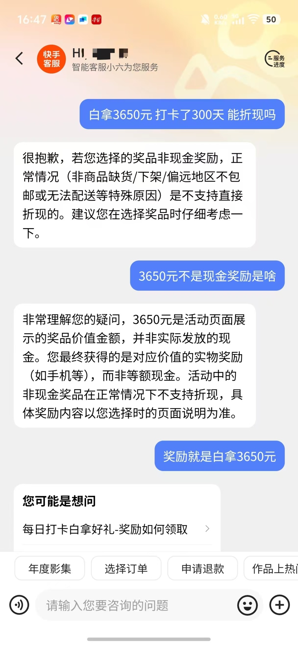 每天坚持数小时打卡快手做任务,参加“打卡365天”白拿手机、白拿3650元活动,结果分别在242天和300天时出现“拉人头”任务而被迫中断。 男子认为自己付出心血与时间,遇到平台套路,要求快手折现补偿。12月30日,快手回复称,非现金奖励不可折现,“3650元是奖品价值,不是现金。” 男子投诉: 参加快手打卡365天活动,每天看数小时,快完成时突然要“拉人头” 50岁的刘先生是重庆人,“我平时打零工,大部分时间在家照顾生病的母亲,快手上有很多免费‘挣钱’的活动,我抽空余时间在快手极速版平台做任务。我有两个快手账号,分别参加了白拿手机和白拿3650元奖金的活动。任务要求都是连续打卡365天,我每天认真坚持,每天看广告、视频,刚开始一天看一两个就能打卡,后来越看越多,任务越来越费时间,每天都得花费两个小时以上。”刘先生说,有的视频要求看30分钟、40分钟以上,但并不是播放够时长就行,人必须要时刻拿着手机看着,隔一会儿手动点一下屏幕,“否则视频虽然一直在播放,计时器已悄悄停下了,如果不留意,一天都完成不了任务。”  刘先生说,为了打卡,每天“兢兢业业”,付出了“心血和时间”,然而,做到两三百天的时候,就会被“无法完成”的拉人头任务终止。“做了300天任务的手机是2024年11月1日左右开始的,坚持到2025年8月27日被迫中断,选择的任务奖励是3650元现金。做了242天任务的手机是2024年10月25左右开始的,坚持到2025年6月25日被迫中断,选择的任务奖品是iPhone16PRO手机一部。”刘先生说,两部手机共做了任务542天,每天约两小时,中断是因为平台任务新增了“拉人头”。  “费时费力的我都能坚持完成,眼看快到365天打卡签到结束了,让我拉人头,还要30天没登录过快手的新用户,我上哪找去?”刘先生说,快手各种不定时、不定量、无底线地不断增加难度,其所谓的“免费”“白拿”是幌子,“夸大其词误导用户,其任务规则的不公平公正,不合理、不透明、含糊坑人。” 刘先生联系快手询问此事,“客服说已经断签了,任务就失败了,可以花钱恢复续签,但依旧要拉人头,还是完成不了,所以也没必要。”刘先生认为,快手平台应该按照工时、任务时长折算奖品价值,支付现金给参与打卡的用户,该诉求遭到快手客服拒绝。   记者调查: 拉人任务并非定时出现,断签后续签要收费,不少网友也有相同遭遇 在刘先生的活动进度截图上,华商报大风新闻记者看到,活动为“完成365天打卡任务 白拿好礼”。一项为现金奖励3650元,已坚持300天,挑战进度82%距离拿奖还差65天,当天打卡任务完成5/6,未完成的任务为邀请1名30天没来用户打开快手,已完成的任务有每日签到、看45分钟短剧、看30分钟视频、看10个精彩内容、看5个广告等。另一项白拿好礼为iPhone16PRO,未完成任务相同,完成的任务有看30分钟视频、打开支付宝、看10个精彩内容、看15个广告等。 在社媒平台上,不少网友反映打卡“白拿好礼”的任务“很坑”。有网友发帖称,他从打卡286天开始,到287天已经连续两天需要拉一位30天以上未登录的用户了,“到最后也不知道要拉多少个人才可以完成,哪里有那么多好友,而且后面可能还不止一人或者拉新用户,浪费了那么多时间和精力。”评论中有人回复,自己打卡301天了,“让邀请朋友,不知道该咋整?”  还有网友说,自己断签了,又拉不到新人,又舍不得放弃,“第一次断签就这么贵,难受。”附上截图显示,要完成续签,支付86.88元+11200金币,或邀请5位新用户。 华商报大风新闻记者发现,“拉人头”任务并不是在固定天数定时出现,有网友在201天时就遇到邀请好友来快手,有网友因301天时拉不到“人头”发出求助:“有哪个好心人帮我找一个符合要求的新人?求求了。”还有网友说:“早点出这个邀请任务,那我早就放弃了,卡在305天,巨坑。” 记者体验: 下载快手极速版后未使用,却经常推送提现通知,除了白拿iPhone还有瓜分百亿等 华商报大风新闻记者下载快手极速版和快手App,均有签到挣钱的活动。下载快手极速版之后的几天,记者并未使用过该App,但经常收到账户通知,“点击立即可领取,提现到微信秒入账。”,快手也是打开就会有“连续签到14天得8.2元”等弹窗。活动页面推荐的有白拿iPhone、边看边赚钱、走路赚钱、瓜分百亿等。记者看到,在快手白拿好礼的活动页面,打卡时间最短的活动为白拿20元现金奖励,须打卡30天;最长的为白拿手机,须连续打卡365天,目前的奖励为小米17Pro12GB+256GB颜色随机。 快手回复: 365天打卡拿手机,不想拉新人任务无法指定,拉多少人也随机 12月30日,针对有人质疑白拿手机活动是骗局的说法,华商报大风新闻记者联系快手客服进行咨询。快手人工电话客服一直无法接入,线上客服解释说,该活动是真实有效的,完成连续打卡的指定天数,中途不可断签,即可获得选中的奖励。需注意的是,打卡任务包括基础签到和升级打卡任务。升级任务中,需要邀请新用户、观看视频等,才可满足打卡条件。此外,任务无法取消或删除,“如选择了365天的打卡任务,完成后可得手机,但是期间不想有拉人邀新等任务,这个是无法指定的,任务内容需要以页面显示为准的。奖品价值越高,对应的连续打卡天数越长、所需完成的任务难度越大。” 打卡白拿手机究竟要拉多少人?客服说,任务中是否包含邀请新用户以及具体需要邀请多少人,均由系统随机下发,无法提前预