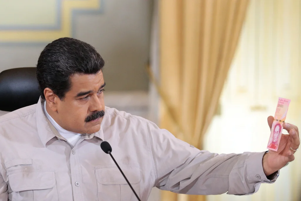 当地时间2016年12月15日,委内瑞拉加拉加斯,委内瑞拉总统马杜罗接受电视采访,展示硬币与纸币。视觉中国 图