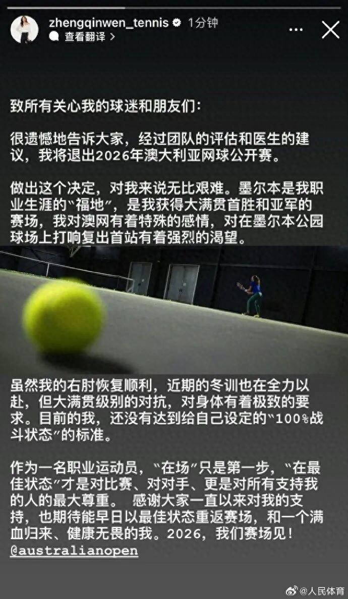 据人民体育微博消息,1月8日,郑钦文通过个人社交平台宣布将退出2026年澳网。 以下为原文: 致所有关心我的球迷和朋友们: 很遗憾地告诉大家,经过团队的评估和医生的建议,我将退出2026年澳大利亚网球公开赛。 做出这个决定,对我来说无比艰难。墨尔本是我职业生涯的”福地”,是我获得大满贯首胜和亚军的赛场,我对澳网有着特殊的感情,对在墨尔本公园球场上打响复出首站有着强烈的渴望。 虽然我的右肘恢复顺利,近期的冬训也在全力以赴,但大满贯级别的对抗,对身体有着极致的要求。目前的我,还没有达到给自己设定的“100%战斗状态”的标准。 作为一名职业运动员,“在场”只是第一步,“在最佳状态/才是对比赛、对对手、更是对所有支持我的人的最大尊重。感谢大家一直以来对我的支持,也期待能早日以最佳状态重返赛场,和一个满血归来、健康无畏的我。2026.我们赛场见!
