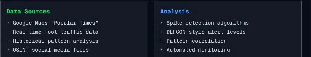 这类账号的运营者基本主要为开源情报爱好者和软件工程师,他们构建一套分析数据的系统。如,根据pizzint.watch运作原理,系统会对谷歌地图的热力数值、门店监控客流量数据、平台订单受欢迎指数、社交平台讨论趋势和标签等数据进行抓取和整合,同时通过Supabase数据库进行历史数据跟踪,分析模式相关性。