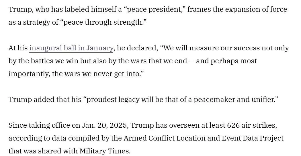 美国《军事时报》1月1日报告指出,自2025年1月20日上任以来,特朗普至少监督了626次空袭,主要海外作战地点包括索马里、伊拉克、也门、伊朗、委内瑞拉等,而显然,这一系列军事行动的发生并不都能够在披萨指数上找到答案。
