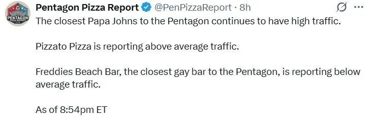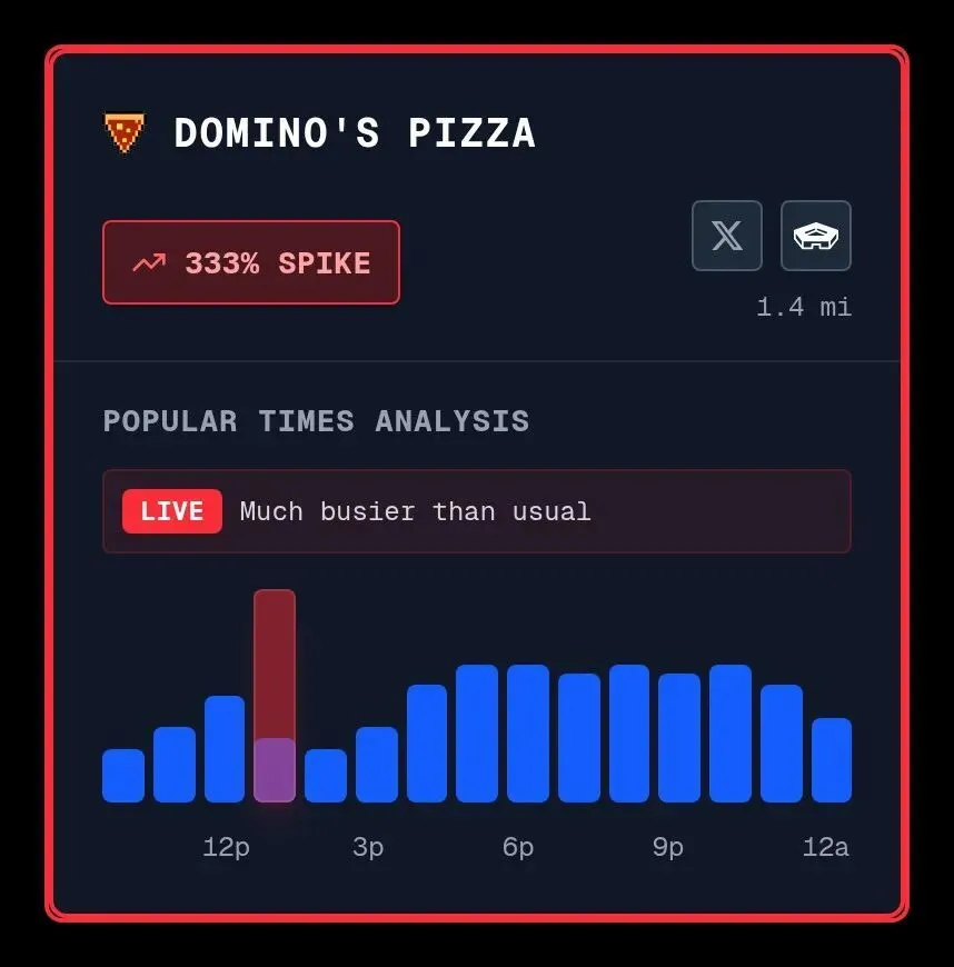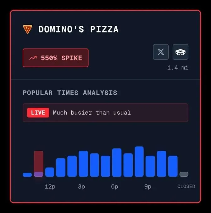 目前,有一类专门用来观测五角大楼附近披萨店订单量的账号,如开篇提及的Pentagon Pizza Watch(其背后是一个公开的披萨指数实时观测平台pizzint.watch)和Pentagon Pizza Report。