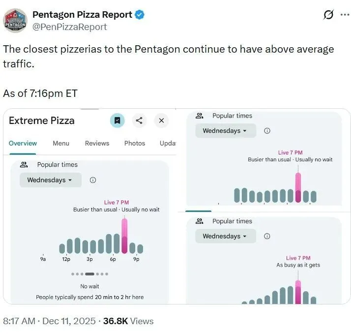2025年6月,Pentagon Pizza Report在以色列伊朗冲突前夕也发布过披萨指数,并被视为冲突前的预测性数据,《新闻周刊》报道称,五角大楼发言人否认了这一点,他表示,“五角大楼内有很多披萨可供选择,还有寿司、三明治、甜甜圈、咖啡等等。”