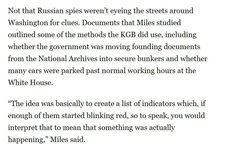 Miles研究的文件概述了克格勃确曾使用的一些方法,包括政府是否将开国文件从国家档案馆转移到安全的掩体,以及白宫是否在正常工作时间过后停放了许多汽车。这类做法通常会建立一个指标列表,如果足够多的指标开始出现红色预警,可以说这意味着确实发生了一些事情。