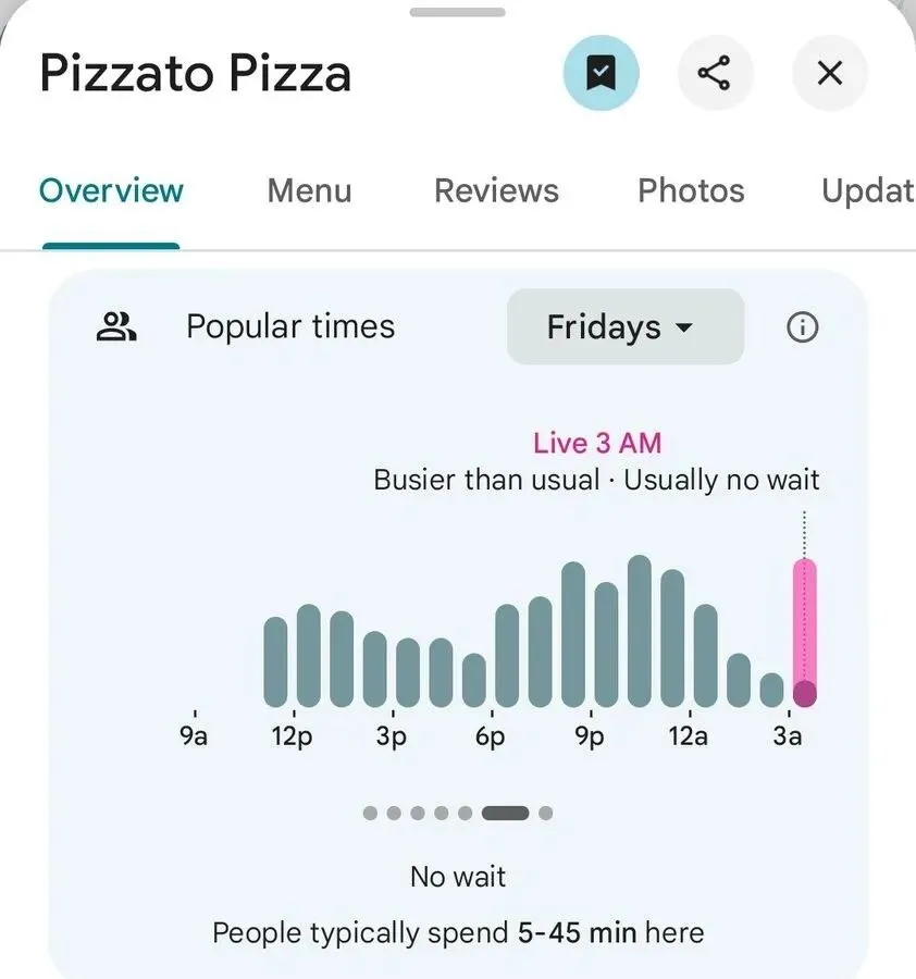 而Pentagon Pizza Report账号的数据报告主要源自谷歌地图流量监测,谷歌地图的API体系是对开发者开放的,该账号完全可以抓取谷歌地图上五角大楼附近披萨店的“热门时段”和“实时访问”数据。不仅如此,该账号还会在披萨之外交叉验证其他间接指标,如,监测五角大楼附近的一家酒吧Freddies Beach Bar客流量是否降低。