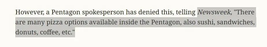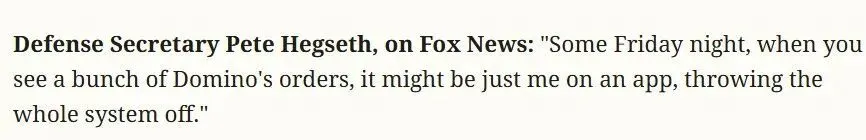 此外,《新闻周刊》2025年10月报道,美国国防部长赫格赛思暗示,国防部可能会故意订餐以迷惑披萨订单追踪者。