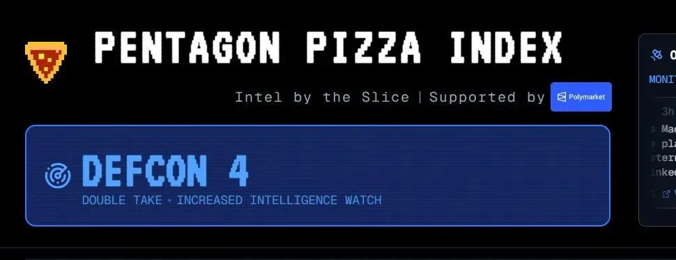 时间线往前推,美东当地时间1月2日13时,一个名为Pentagon Pizza Watch(五角大楼披萨观察)的X账号发文称,“达美乐披萨店(距离五角大楼1.4公里)业务量激增333%。必胜客披萨店(距离五角大楼3.7公里)业务量同样飙升至178%。当前DEFCON等级为4级。”