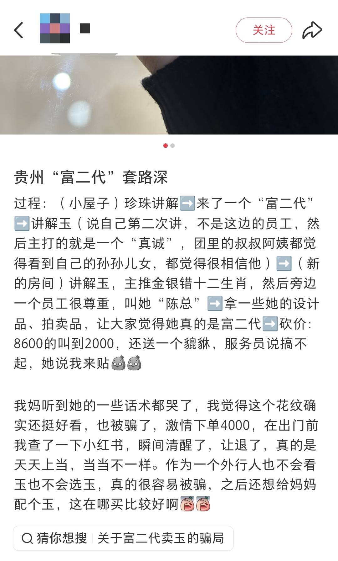 封面新闻记者 马嘉豪 暗访视频中,一位自称“家族产业继承人”的年轻男子,在密闭隔间内向游客推销劣质玉石,而这一切都隐藏在贵州长顺县一个偏僻小镇的建筑中。 近日,旅游打假博主“大娃”发布视频称,贵州长顺县存在“富二代卖玉”骗局,称有商家通过伪装富二代身份,向游客兜售假冒伪劣玉石产品。 1月7日,长顺县市场监督管理局回应封面新闻记者,已介入调查,并查封相关店铺,消费者相关赔偿事宜也正在进行。  商户售卖的玉石。 “富二代”卖玉骗局:拼多多48块买进,转手千元出售 博主“大娃”黄先生告诉封面新闻记者,此前他在社交媒体上看到多名网友反映,在贵州旅游期间遭遇“富二代卖玉”骗局,于是他决定实地暗访调查。 黄先生还表示,他发现“富二代卖玉”骗局已运作长达两三年,主要针对中老年游客群体。 于是在2025年11月20日,黄先生通过抖音直播报名参加了“贵州5天4晚游”低价团,跟随一群老年人到达贵州长顺。 “早上7点就被带到长顺县一个很偏的小镇,一整排房子被隔成十几个小房间。”黄先生描述道,“每个旅游大巴的游客被带进一个隔间,外面还有人守着。” 黄先生回忆,最初进入房间时,销售人员并不直接推销玉石,而是讲解珍珠等产品,逐渐让游客放松警惕。约半小时后,一名自称“家里开玉石厂”的年轻人“偶然”进入房间,声称自己不是工作人员,只是“家里产业”的继承人。 “他表现得非常真诚,说今天特别高兴,背着家里人做主,把这些‘价值不菲’的玉石低价卖给游客。”黄先生说,这名“富二代”将标价8600元的玉牌降价至2000元,还赠送貔貅挂件,现场工作人员则配合表演,不断劝阻“这样卖会亏本”。 “相同款式的玉石在拼多多上只需要几十块,而他们却以十倍甚至百倍的价格进行出售。” 黄先生在采访中还表示,这家售卖玉石的店铺连一个门头都没有,“甚至不知道这家店叫什么名字,只知道在长顺县一家名为‘语林儿童托管服务中心’的房子里。”  博主在现场与玉石商户对峙。 从黄先生提供的现场视频来看,在他揭露了商家骗局后,当地职能部门也来到现场进行处理。 1月7日,长顺县市场监督管理局工作人员回应封面新闻记者时表示,涉事商家涉及虚假宣传问题,目前已对该店铺进行查封,并立案调查。消费者可凭购买时获得的“珠宝质量保证单”联系商家退款,还可向市场监管部门投诉。 随后,封面新闻记者还联系到长顺县文旅局,了解旅游团与玉石店是否存在“关联”。工作人员表示,需向相关科室了解情况后回电,截至发稿,暂未收到回复。 以“富二代卖玉”人设设局,全国多地出现 封面新闻记者梳理多个社交媒体平台,发现此类“富二代卖玉”套路在多个旅游省份均出现过,且套路高度相似:游客被带入封闭空间,“富二代”突然现身,自称家族经营玉石产业,以“交朋友”“今日开心”为由低价销售,工作人员则在一旁配合表演。 一名四川游客在小红书上分享了自己母亲受骗的经历:“那个(“富二代”)女孩长得特别纯真,说话支支吾吾的,让人觉得她真是第一次讲。她说前一天没人听她讲,今天看到大家这么认真特别感动,要给大家‘福利价’。”  网友在社交媒体平台分享自身的被骗案例。 旅游行业业内人士把问题归因于“低价团”:即旅行社以明显低于成本的团费吸引游客,再通过购物回扣弥补亏损,甚至实现盈利。 “要根治这类问题,需要文旅、市场监管、公安等多部门形成常态化联合监管机制。”多位业内人士表示,“同时应建立旅游购物场所白名单制度,对合格商家进行公示,引导游客理性消费。” 黄先生也向封面新闻记者表示,他将继续关注低价旅游团的乱象,通过发布暗访视频增强公众防范意识。“希望游客们报团时擦亮眼睛,不要盲目相信低价引流,正规旅行社才有保障。” (部分图片由受访者提供)
