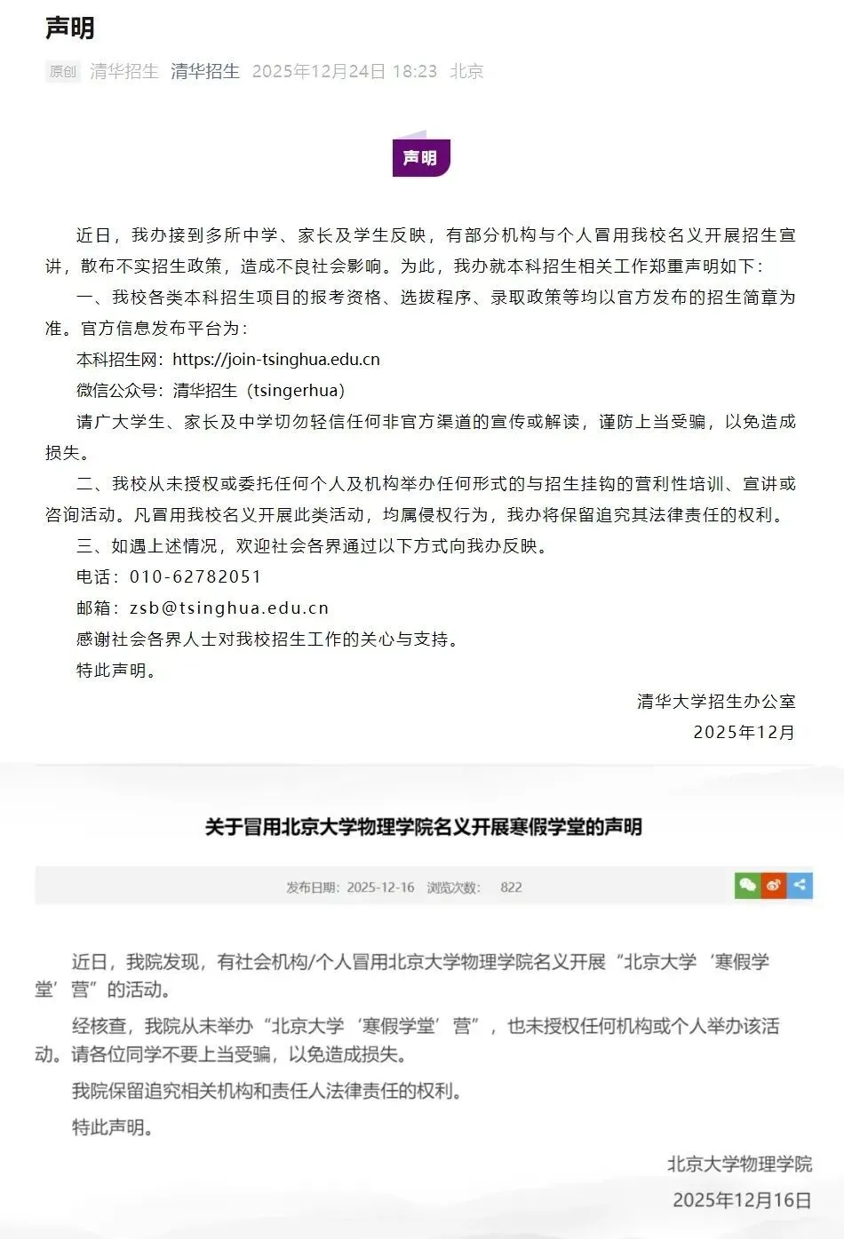 寒假临近,你是否收到过一些打着高校名义的“培训营”“招生咨询”“教授内推”等“消息”?近期,北京大学、清华大学、香港大学等多所高校接连发布官方声明,针对冒用学校名义进行的虚假招生、违规培训等活动进行辟谣,严厉打击网络谣言违法犯罪活动,旨在为教育营造清朗网络空间。