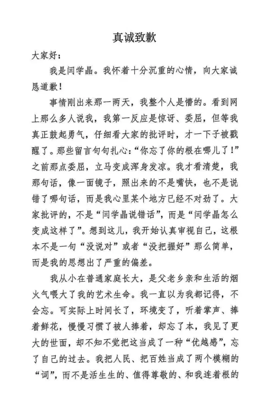 11日晚,闫学晶在朋友圈发文道歉,坦言“这根本不是一句‘没说对’或者‘没把握好’那么简单,而是我的思想出了严重的偏差”,要“真正‘沉下来’重新把心擦干净”,认识也算是深刻。且观以后。