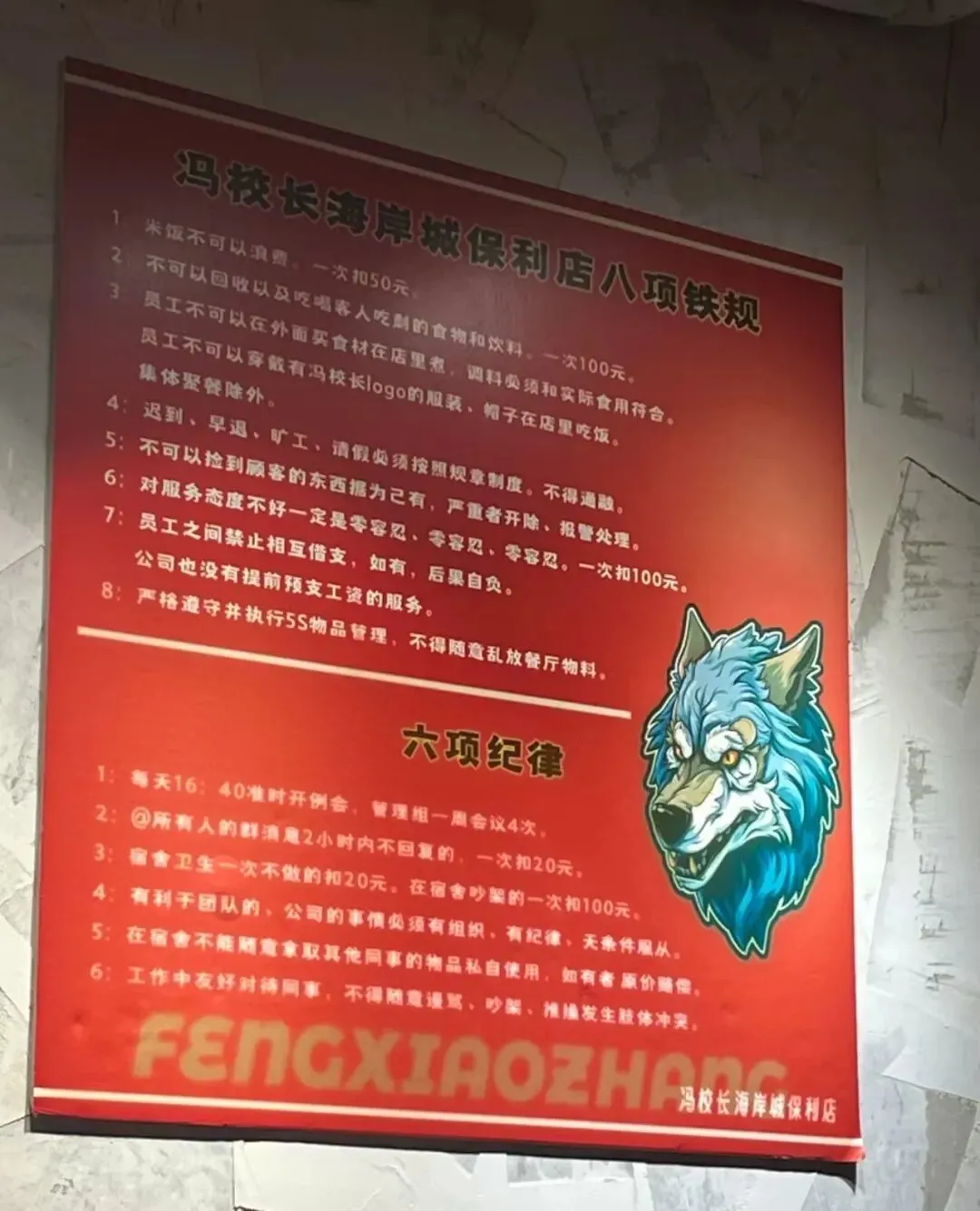 近日,位于深圳的冯校长老火锅南山保利店内张贴的“八项铁规和六项纪律”引发关注。其中,“两小时不回群消息扣20元”“宿舍吵架每人罚100元”等条款被指过于严苛,涉及员工私人生活,引发网络热议。