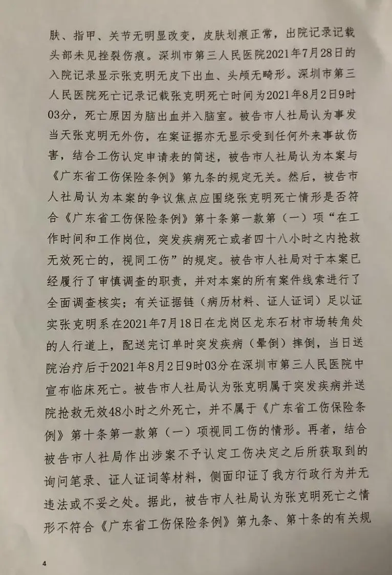 但她的申请未被通过。深圳市人社局不予认定的理由是,根据《工伤保险条例》,张克明死亡时间是8月2日,距事发的7月18日已远超48小时,不符合“在四十八小时之内经抢救无效死亡视同工伤”的规定。