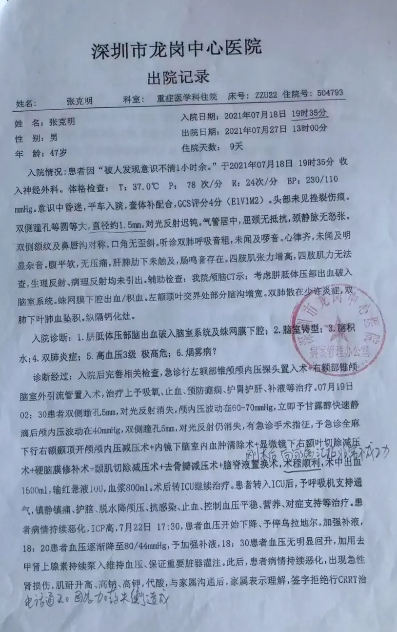 ▲张克明的出院记录,显示他入院后病情恶化的情况