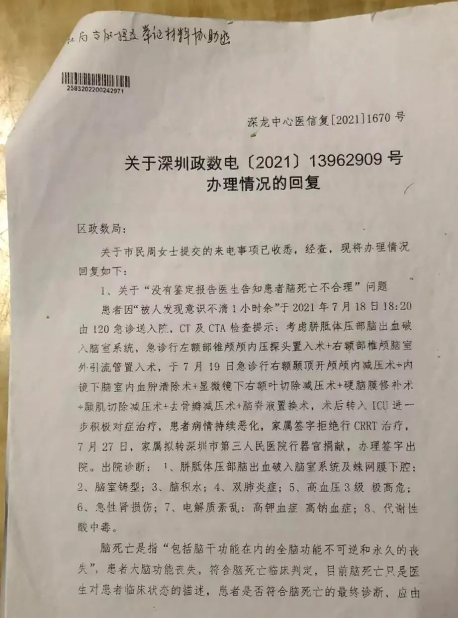 几天后,在医生建议下,她同意将丈夫转至深圳市第三人民医院进行器官捐献,该院具备脑死亡判定资质,张克明才被判定为脑死亡。