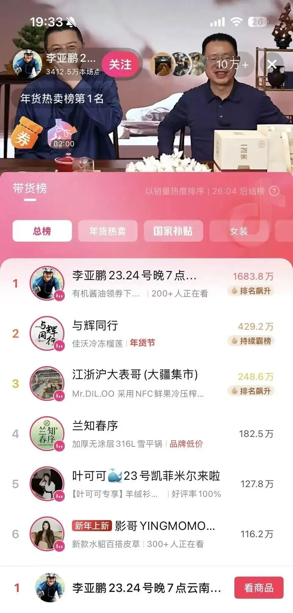 数十万网友涌入,李亚鹏带货登总榜第一,90分钟销售额破5000万元,热度远超与辉同行