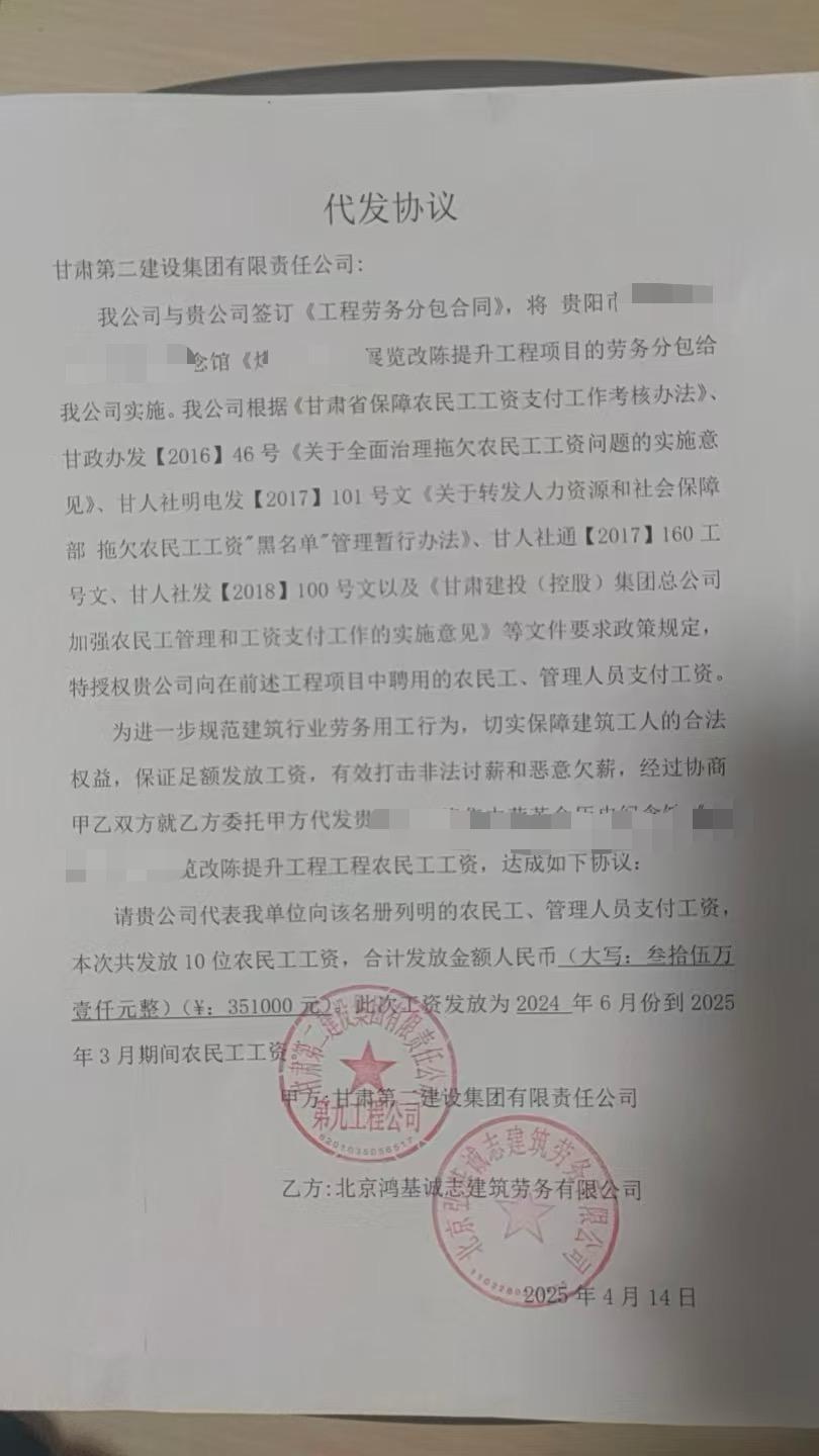那先生提供的一份《代发协议》显示:甘肃二建与北京鸿基诚志公司,根据名册列明的农民工、管理人员代支付工资,本次共发放10位农民工工资,合计35.1万元。此次发放为2024年6月份到2025年3月期间农民工工资。协议盖有甘肃二建和北京鸿基诚志公司的公章,落款时间为2025年4月14日。