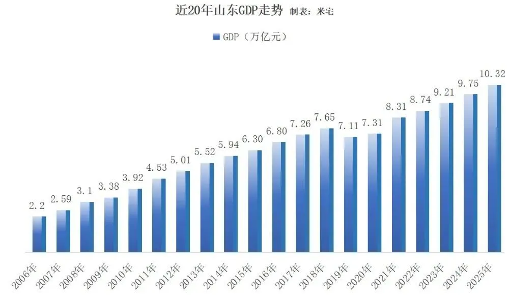 2006年到2025年,山东GDP从2.2万亿,涨到10.32万亿,足足翻了5倍。