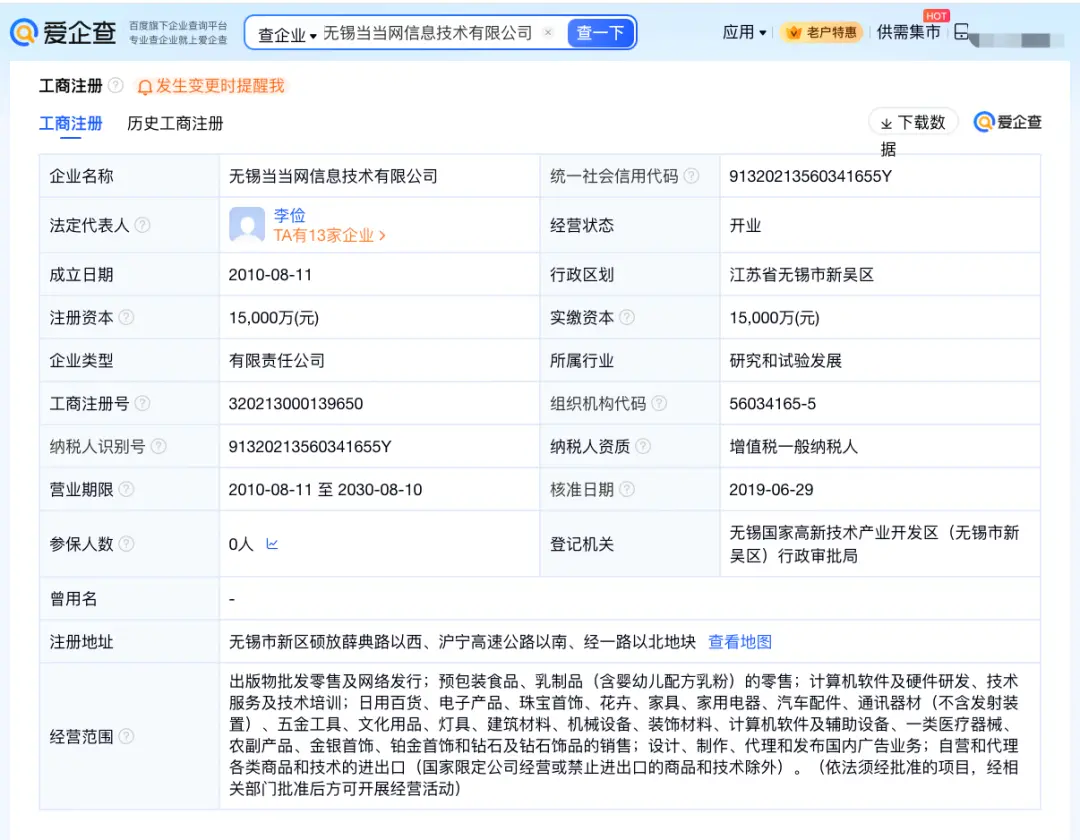 爱企查App显示,近日,无锡当当网信息技术有限公司因违反劳动法相关规定,被无锡市新吴区人力资源和社会保障局处以警告,并罚款1.2万余元。 处罚事由显示,该公司2024年3月至2025年2月实行综合计算工时工作制的员工中有27名员工违反规定延长劳动者工作时间,27人人均月延长工作时间为149.39小时。无锡当当网信息技术有限公司成立于2010年8月,法定代表人为李俭,注册资本1.5亿元人民币,经营范围包括计算机软件及硬件研发、技术服务及技术培训等,由北京当当网信息技术有限公司、北京当当科文电子商务有限公司共同持股。