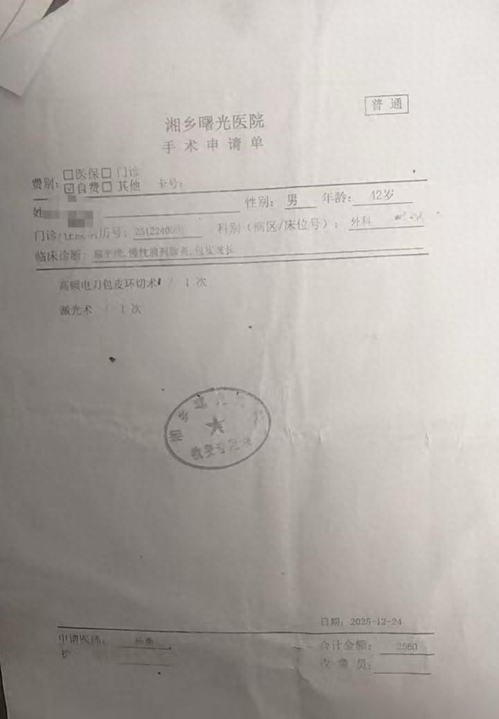 “我现在只想曝光此事,不需要医院赔偿。”1月26日,周先生气愤地告诉澎湃新闻,2025年12月,他在湖南湘乡曙光医院做完包皮术后输液时,发现所输碳酸氢钠注射液已过期,双方多次协商及卫健部门行政调解均未果。 湘乡市卫生健康局工作人员向澎湃新闻表示,因当事人明确表示要追究医疗机构的责任,已将此线索移交至执法部门查处。 2025年12月24日,42岁的周先生在湖南省湘乡曙光医院接受包皮手术后,院方告知其前列腺存在问题,需进一步治疗,并为其安排了输液消炎。然而,在输注第二瓶液体时,周先生发现该药品已过期,他当即就此事向医护人员反馈。面对质疑,医护人员解释称,该药品为冲洗类药物,虽已过期两个月,仅会导致药效降低,不会对人体造成危害,医院工作人员回应周先生称:“它不是那种吃进去的,吃进去的也没关系”,“没有坏处的,你放心”。