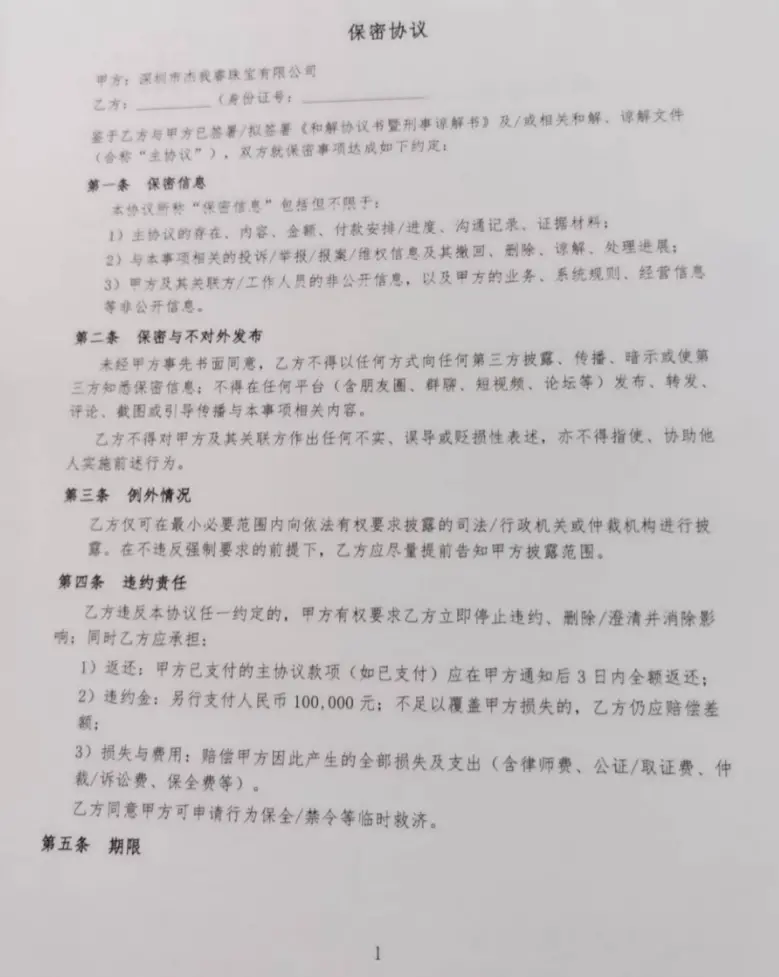 “协议里写得很清楚,一旦我们签署,就不能再在网络上、私下里提及任何与杰我睿相关的事宜,哪怕是和其他受害者交流,只要被平台发现,就要承担10万元的赔偿责任。”