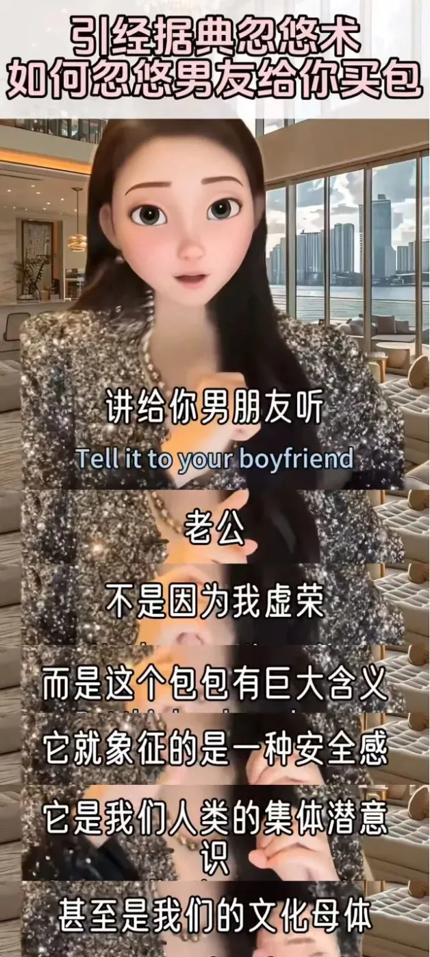 有的教学,是让男朋友为自己购买奢侈品,攻略核心是示弱,或是营造别人都有而自己很羡慕的氛围,以此触发对方的保护欲与攀比心。
