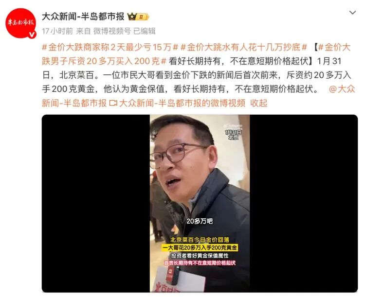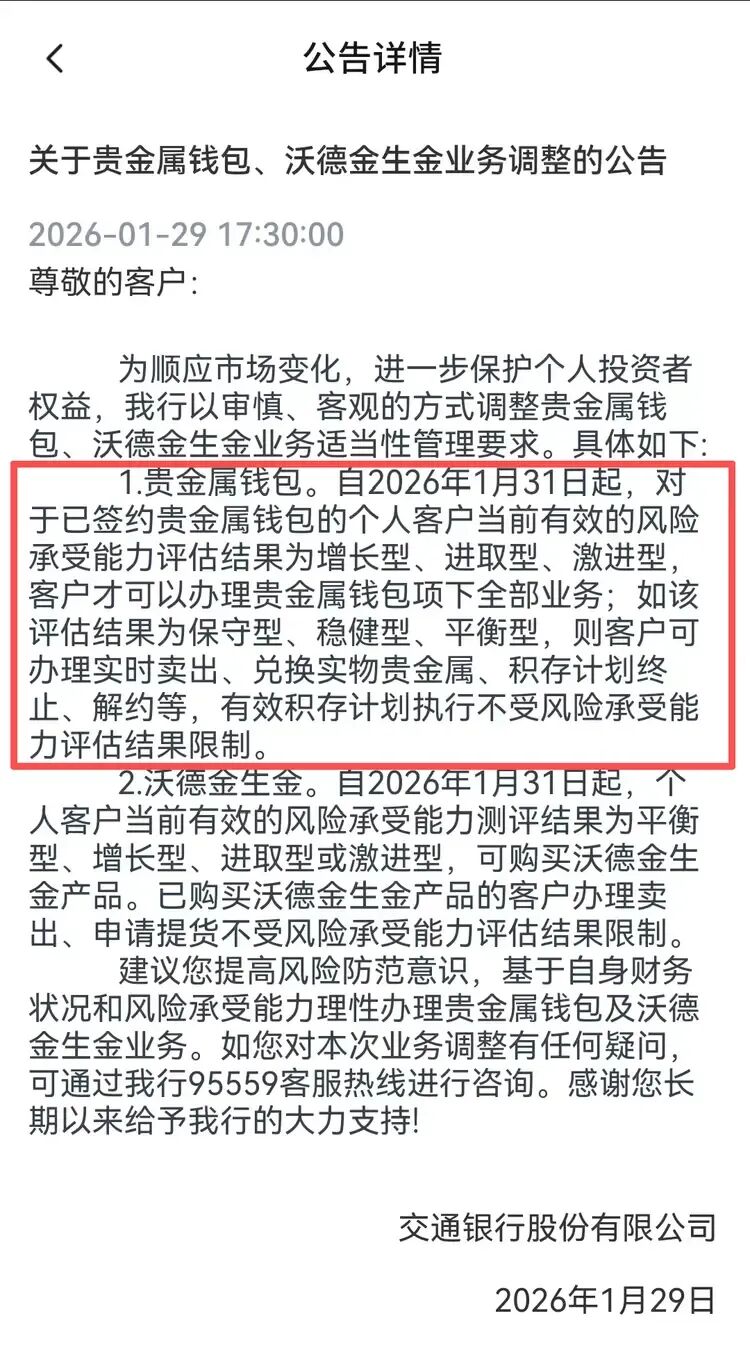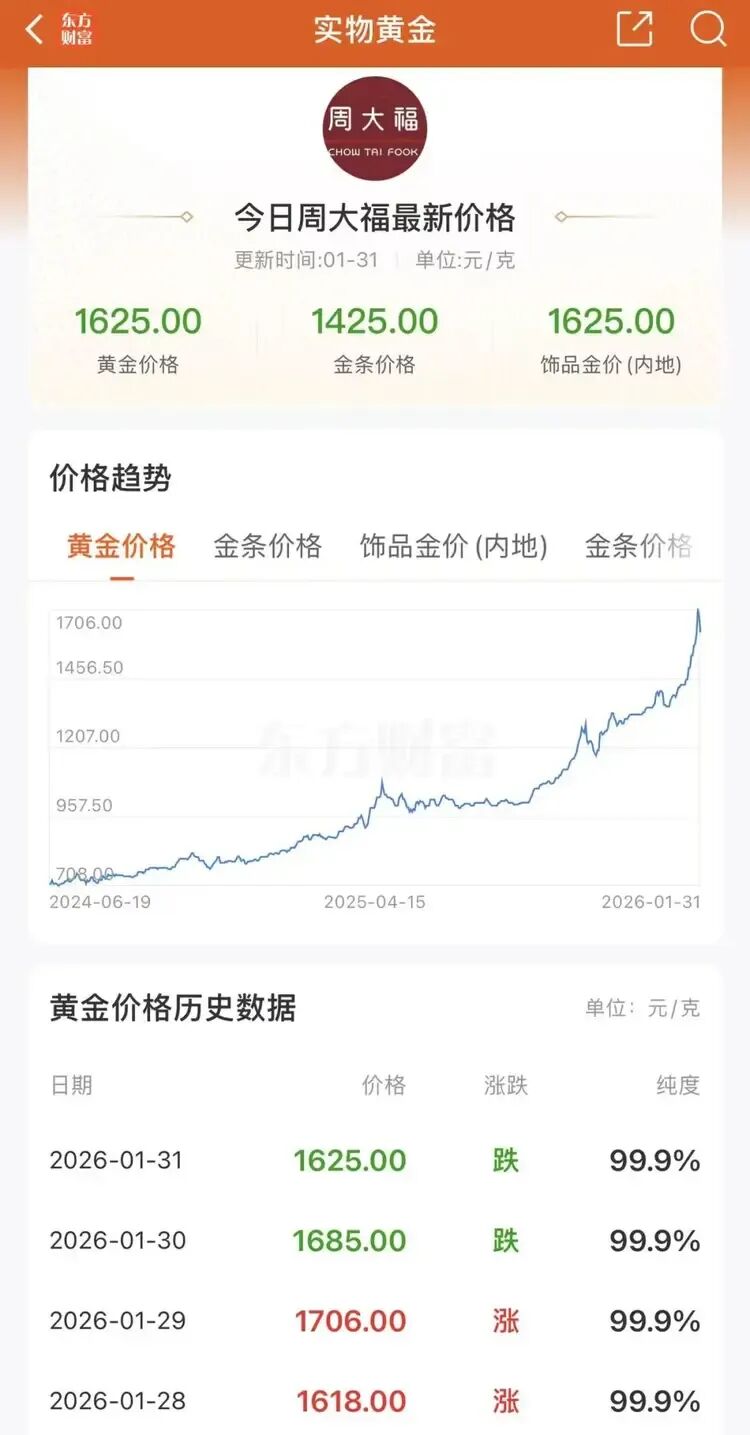 金价经历强势上涨后迎来调整。1月30日,纽约商品交易所4月黄金期价一度跌破每盎司4800美元关口,跌幅超过10%;现货黄金单日最大跌幅超12%,盘中最低触及4682美元/盎司,收盘下跌9.25%报4880.03美元/盎司。受金银价格大幅回落影响,国内品牌金饰门店足金饰品和工艺金条价格同步下调。两天内,多数产品单克价格回落幅度在80元左右。 据媒体报道,1月31日,记者走访北京金店,发现旧金回收处排起了长队,与此同时,在投资金条处,一些消费者则选择逢低买入。  市民排队购买黄金 另据大众新闻-半岛都市报报道,1月31日,在北京菜百,一位市民大哥看到金价下跌的新闻后首次前来,斥资约20多万元入手200克黄金,他认为黄金保值,看好长期持有,不在意短期价格起伏。  在江西南昌,也有市民一大早赶到金店,准备花十几万元买金饰,“看黄金跌了一百多,赶紧来买,怕还要涨,能戴也能投资,有闲钱就买点,看这样肯定还会回调。”  1月31日,有江西南昌的黄金商家表示,“前天1200多元收的,有涨有跌都是这样,(不过)大家都是看涨,(期待)过年能涨到1500元左右”。 1月30日,黄金遇40年来最大单日跌幅;白银创历史最大盘中跌幅,一度超过35%。国际金价崩盘跳水之际,这几天金饰克价继续跌,从1700元掉到1500元。在国内头部金饰品牌克价一度冲破1700元大关之后,价格迎来了持续的回落。  黄金最新价格 1月31日,周大福金饰报价1625元/克,周生生金饰报价1618元/克。而1月29日周大福金饰报价1706元/克、周生生金饰报价1708元/克,1月30日周大福金饰报价1685元/克、周生生金饰报价1683元/克。以此计算,周大福金饰克价在1日内跌了60元、2日跌了81元。周生生金饰克价1日跌了65元,2日跌了90元。  1月31日,周大福金饰报价1625元/克 据媒体报道,当前市场机构普遍形成 “短期谨慎、长期乐观” 的判断,认为短期调整风险上升,但中长期金价上涨的核心逻辑未发生逆转。 据期货日报报道,招商银行研究院资本市场研究员陈峤认为,金价此次下跌的根源是市场过热。随着金价加速上涨,市场斜率已极为夸张,部分市场指标也呈现出过热迹象,投机类资金存在止盈动力。 一是波动率逼近历史极值。截至1月29日,黄金ETF波动率攀升至46.02%,与2020年疫情时的极值48.98%仅一步之遥。 二是金价上涨斜率罕见。自1968年以来,黄金单月涨幅超过20%的情形极为罕见,仅出现过8次,且全部集中在布雷顿森林体系瓦解、第二次石油危机等特殊历史阶段。1983年之后,如此级别的单月涨幅更是从未出现。 “当金银价格以超越历史的陡峭斜率攀升时,暴跌只是时间问题。”国泰君安期货贵金属研究员刘雨萱表示,诱发“踩踏式”暴跌的原因主要是美股回落。本周四晚间,微软财报未达预期,致使核心圈资产价格下跌,进而引发连锁的流动性挤兑。恰逢金银交易呈现极端趋同态势,多项指标显示超买情绪爆棚,从而引发多杀多行情。 金瑞期货贵金属研究员吴梓杰告诉记者,进一步的推动因素来自美国总统特朗普对新任美联储主席的提名。本周五,特朗普宣布提名凯文·沃什为下一任美联储主席人选。鉴于沃什过往在政策立场上更强调通胀约束、倾向推进资产负债表收缩,并对金融风险偏好与投机行为持更审慎态度,市场将该提名解读为未来美联储政策可能更偏“鹰”、货币再宽松的空间与节奏面临再评估的潜在风险上升。 刘雨萱认为,贵金属市场需要一段时间来消化震荡,并探寻新的博弈后均衡价格。 在本周贵金属价格出现剧烈波动前后,有两家国有大行要求客户在办理相关业务时需增加风险评测。 农业银行公告自1月30日起,增加对个人客户参与存金通黄金积存交易风险承受能力测评准入。个人客户办理签约、买入、定投三类业务,风险承受能力评估需达谨慎型及以上,有效测评结果无需重测;卖出、提货、定投计划执行与终止、解约等操作不受该条件约束。  农业银行公告截图 交通银行最新公告显示,1月31日起,增长型、进取型、激进型风险等级客户可办理贵金属钱包全部业务,如该评估结果为保守型、稳健型、平衡型,则客户可办理实时卖出、兑换实物贵金属、积存计划终止、解约等,有效积存计划执行不受风险承受能力评估结果限制。 另外,平衡型及以上客户可购买“沃德金生金”产品,已购买沃德金生金产品的客户卖出存量产品、提货不受限制。  交通银行最新公告截图 据悉,交通银行的贵金属钱包包含黄金买入卖出(活期金)、黄金积存、黄金定存、实物转换等功能。 如以今年1月份为限,则已有工行、农行、交行三家国有大行明确公告相关要求。在此期间,黄金及多种贵金属均迎来一波快速上涨行情。 除此之外,近期多家银行还通过投资起点调整、交易限额调整等手段,进一步提醒投资者注意风险。 建设银行1月30日宣布,2月2日起个人黄金积存定期积存起点上调至1500元,覆盖日均积存及自选日积存,成为首家将参与门槛提至1500元的国有大行。招商银行、平安银行均自2月2日起调整门槛。其中,招行黄金账户活期及定投认购起点调至1200元,平安银行平安金积存定投起投金额从1100元上调至1200元。 交易端管控持续加码。工商银行明确2月7日起,在非上海黄金交易所交易日对如意金积存业务实施限额管理,覆盖全量或单一客户单日积存/赎回上限、单笔积存或赎回总量上限等,并进行动态设置。 1月30日,包括中行、工行、建行在内多