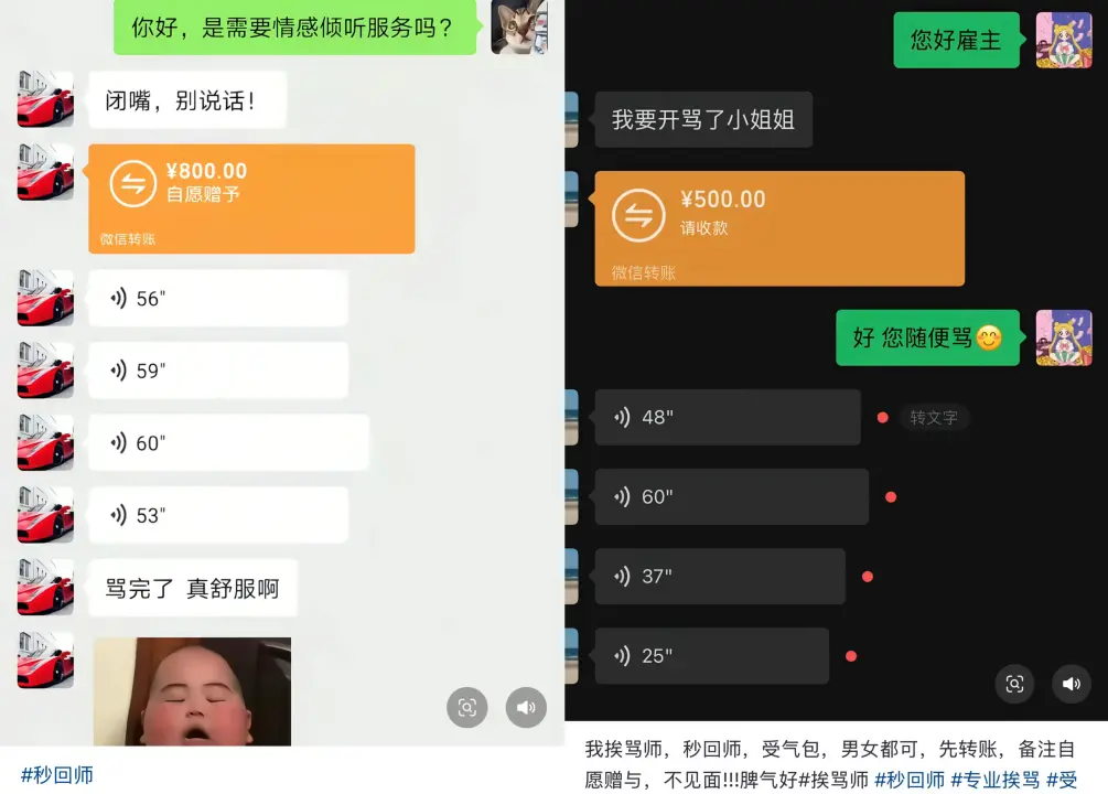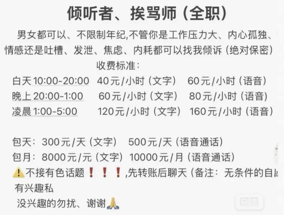 而话题范围,也主要是压力倾诉、解压聊天、治愈陪伴,甚至很多人还会标明有“挨骂师”服务。