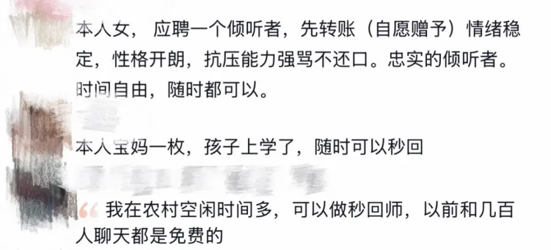 “秒回”“保密靠谱”“24小时在线”……在这些关键词里,能窥见年轻人们需要的付费情绪型陪伴,主要也是想找一个愿意听自己心事的人。