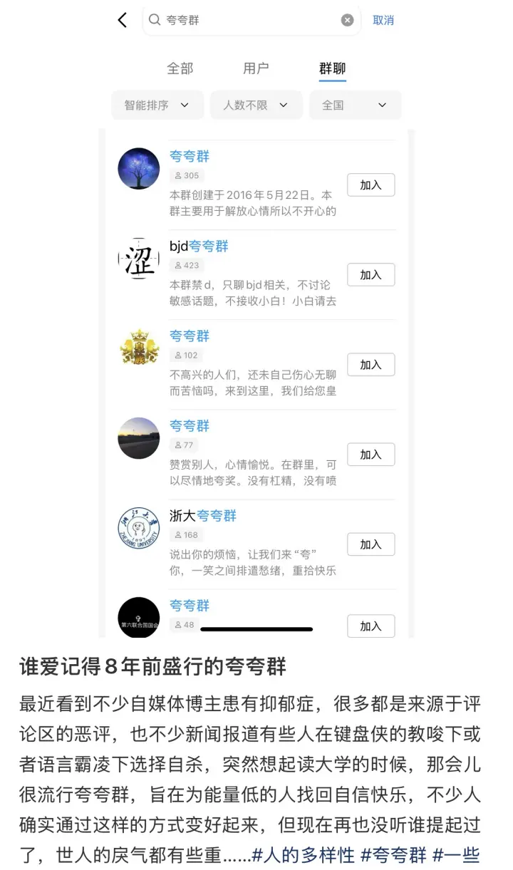 所以当时夸夸群立刻风靡全网,大家都想从中找到积极、找到快乐。