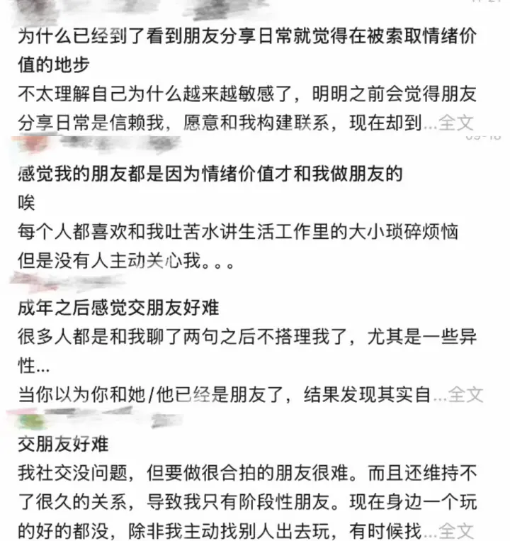 大家一边说着不愿意当别人的情绪垃圾桶,懒得浪费时间、心力去社交,一边又实实在在的感受到孤独,没人主动关心自己,心事不知道跟谁说,交朋友越来越难……