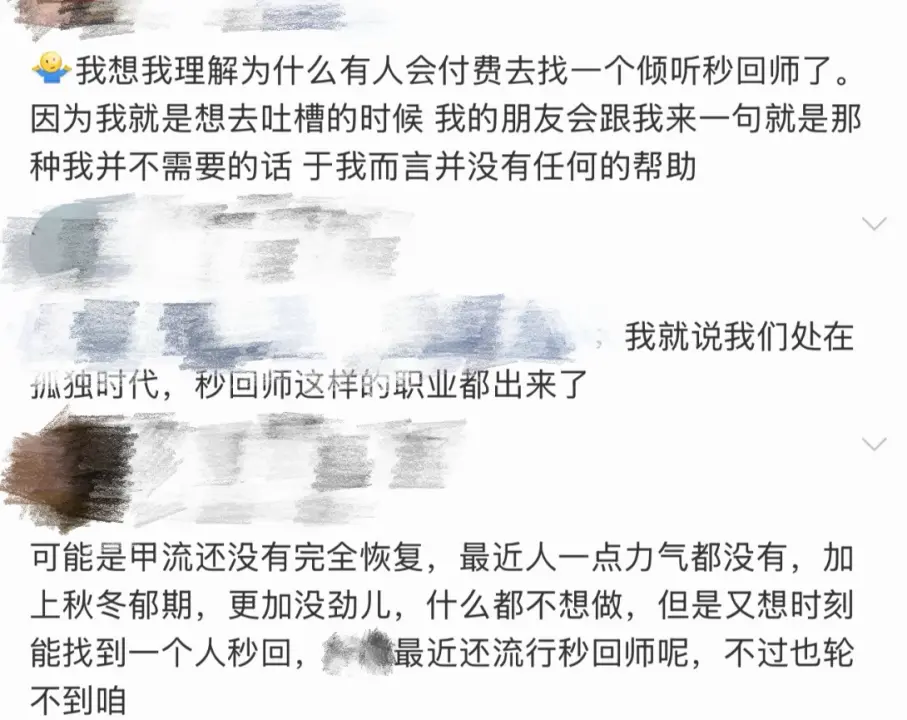 朋友、家人,很难像秒回师那样做到不评判、只倾听,他们的时间更是不一定能和我们的每个emo时刻都能对得上。
