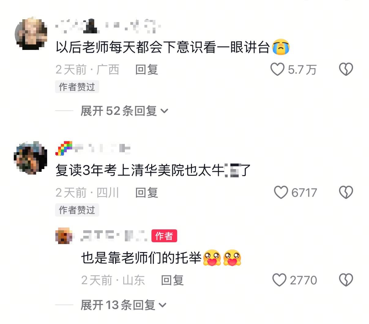 近日,一位大一学生考上清华美院后回高中给班主任惊喜的视频在网络上引发关注。  视频显示,一名学生提前将老师的肖像画放在讲台上,随后穿着高中校服坐在教室,上课后,老师看见该学生笑着说,“哦我终于知道是谁画的了!”画面中配文:当我考上美院偷偷回高中,画了班主任然后放在讲台上。   2月2日,潇湘晨报记者联系到视频发布者山东的周同学。他告诉记者,自己现在在清华美院就读大一,放寒假后有同学陆陆续续回学校看老师,他特意选了一个没有其他同学去的日子,想单独给刘老师一个惊喜。 周同学瞒着班主任,联系另一位老师进了学校,然后在教室里换好了校服。提前画好了刘老师的肖像画,上课前放到讲台上。“刘老师一进来就看到了,却不知道是谁的作品。她专心上了几分钟课,然后才看到台下有个熟悉的同学,才知道是我画的。”周同学说,“刘老师从知识上和心理上都帮助了我很多,所以我才会特意回来看她。”  “刘老师是我的数学老师兼班主任,考学那年,我经常找她问问题。在走廊外的自习室,一讲就是大半节自习课。有时候学习压力大晚上老是失眠,刘老师也会找我谈心,在她的帮助下,我的成绩提升了不少,她也是让我改变最大的老师。”周同学告诉记者,为了考上理想的院校,他复读了三年,“或是专业或是文化分,每次总是差一点。”虽然中间也曾想过放弃,但是功夫不负有心人,2025年6月,他以文化成绩581分,全国第23名被清华美院录取。  现在,周同学的账号有28万粉丝,经常会分享美术作品和生活日常。再回望时,当初觉得跨不过的坎,不过是人生路上的小小印记。他说,“21岁的我以清华学子身份挺直腰板给班主任惊喜时,突然觉得高中复读的3年已经不再是天大的事了。”   许多网友被感动,评论道:“她对视的一瞬间就认出了你,定是老师也在想着你”、“一个好老师能改变一个学生的一辈子,我高中也有一个这样的老师!” 潇湘晨报·晨视频记者徐茜宇