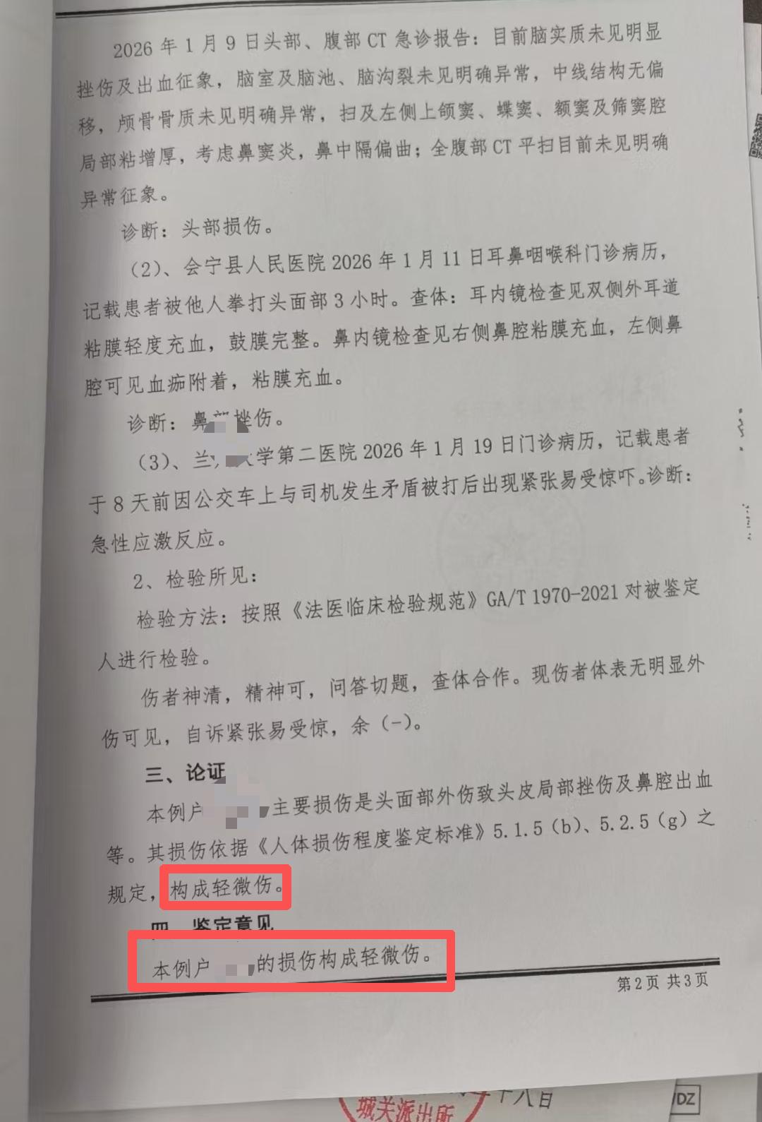 2026年1月11日中午11时46分许,甘肃省会宁县9路公交车上乘客并不多,16岁的学生小户想从前门下车遭到司机拒绝,随后小户轻声骂了司机一句并走向后门下车。司机被骂后,随即从前门下车追上了小户,并在拉拽的过程中打了一下小户的头部。