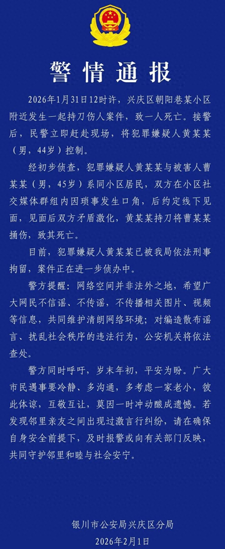 极目新闻记者 舒隆焕 近日,44岁男子黄某某与45岁男子曹某某在小区群发生口角,二人线下约见后又发生争执,黄某某持刀将曹某某捅伤致死。案发后,知情人和商户对极目新闻记者称,嫌犯是一名水果摊摊主,二人发生口角的起因疑似与收取垃圾费有关。 2月1日上午,银川市兴庆区公安通报,1月31日12时许,兴庆区朝阳巷某小区附近发生一起持刀伤人案件,致一人死亡。接警后,民警立即赶赴现场,将犯罪嫌疑人黄某某(男,44岁)控制。 经初步侦查,犯罪嫌疑人黄某某与被害人曹某某(男,45岁)系同小区居民,双方在小区社交媒体群组内因琐事发生口角,后约定线下见面,见面后双方矛盾激化,黄某某持刀将曹某某捅伤,致其死亡。 目前,犯罪嫌疑人黄某某已被警方依法刑事拘留,案件正在进一步侦办中。  警情通报 兴庆区朝阳巷两边分布着多家大型购物中心和小餐饮店。案发现场在朝阳巷北端。案发时,正值中午用餐高峰期。 极目新闻记者注意到,警情通报发布后,多名当地网友提到,黄某某和曹某某发生口角的起因疑似与收取垃圾费有关,黄某某是一名卖水果的摊主。网友表示,涉事人员太冲动了,无论是什么起因,不应该持刀伤人。 2月1日下午,一名知情人向记者透露,据他了解,二人疑因收取垃圾费相关事宜引起争执。事发区域的垃圾费,有人几个月交一次,有人一年交一次。他称,当地的小区群组,有的由小区物业组建,有的是社区组建的,一般社区和片区相关部门人员在群组内,都是为了方便工作,有啥事可以在群里通知。 网友发布的一段5秒现场视频显示,一名黑衣男子倒地不起,一旁的红衣男子疑似在爆粗口。另一名自称目击者的网友表示,此前社交平台上还流传了另一部分视频。 上述知情人和朝阳巷的商户告诉记者,视频中的红衣男子就是黄某某。采访中,该知情人反复强调其不便透露更多情况后又私信记者,二人在群组里争吵时,黄某某说的话很极端。他坦言,黄某某与曹某某在群里发生争执的起因,本来是一件小事,不知为何没人介入调解。后来,二人线下见面再次争吵后发生了持刀伤人事件,“太冲动了。” 2月1日晚,朝阳巷一商户告诉记者,案发时她正在店内忙着出餐,突然看到店外聚集的人越来越多,她以为食客要进店吃饭,去开门时看到了案发现场。有人报警后,警察和医护人员先后来到现场处置。黄某某是水果摊主,其有车摆放在朝阳巷一处献血点附近的固定位置,“黄某某摆摊卖水果那么久,我没跟他说过话。” 关于收垃圾费,该商户表示,垃圾费每年一百多元,商户可以去相关部门交,她不知曹某某是不是收费员;黄某某被收的到底是水果摊位上的垃圾处理费,还是其所住小区的垃圾处理费,也不清楚。 2月2日下午,兴庆区鼓楼社区一名工作人员对记者称,其实社区平常会去调解邻里矛盾,对曹某某的离世表示惋惜。该工作人员及新华街街道办事处、兴庆区政府办的工作人员均表示,当地警方正在办理该案,暂时无法回应更多情况。截至发稿前,记者与兴庆区警方多个部门联系,未获有效回复。 上述商户表示,案发后,相关部门工作人员已上门叮嘱,商户之间、邻里之间遇事要冷静、多沟通、换位思考,有矛盾要及时向社区反映或报警求助。 (来源:极目新闻)