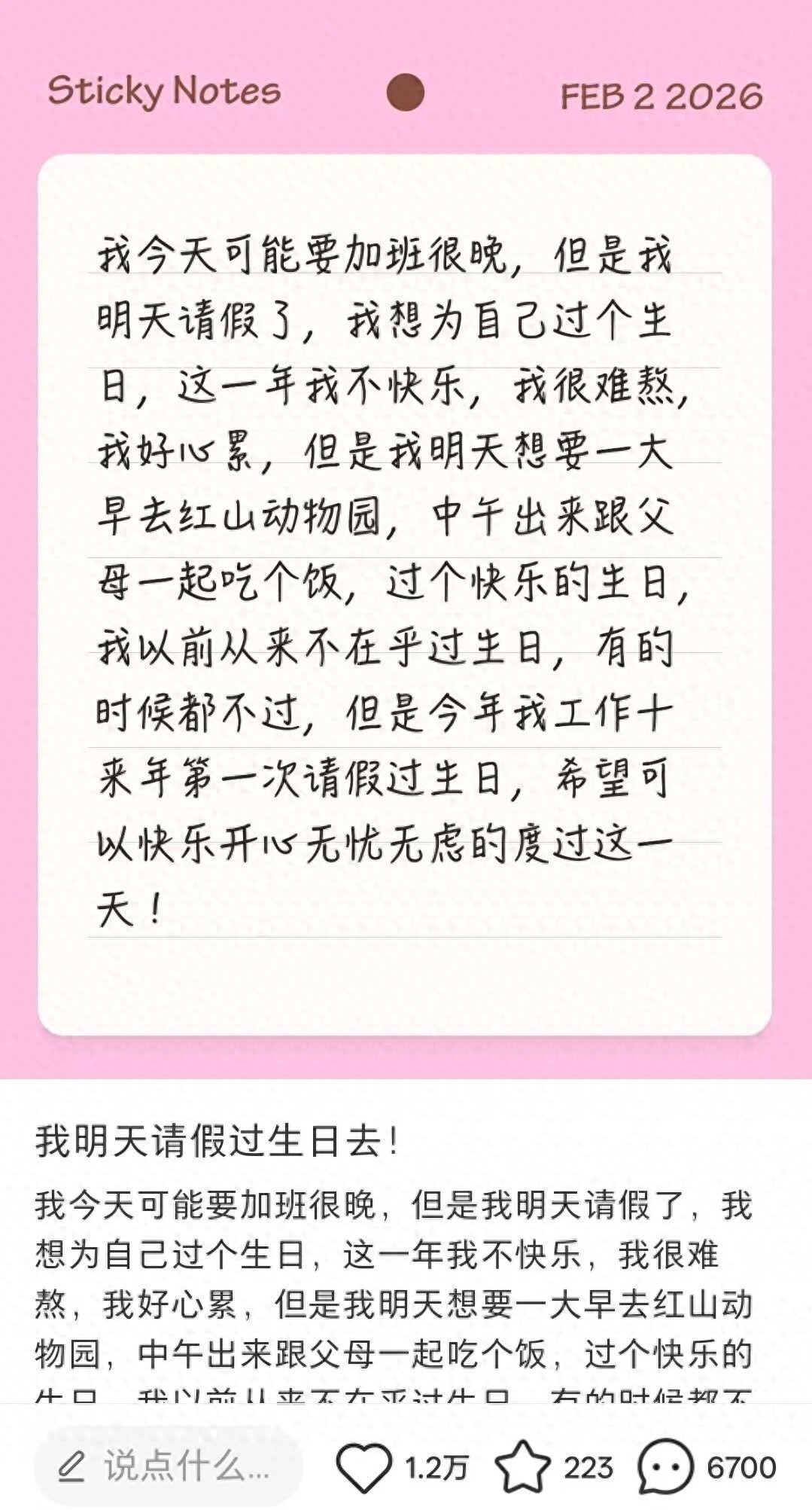“生日前夕还在加班,但这一次,决定为自己请假过生日。这是工作十年来的第一次。计划一早去红山动物园,中午和父母吃饭,简单却认真地迎接属于自己的日子。” 这是最近,南京一位网友在社交媒体的发帖。没想到,这条简单的分享,不仅收到了无数网友的祝福,还得到了南京市红山森林动物园官方的暖心回应。 2月2日,南京网友“跑岔气的小恐龙”在小红书发帖:我明天请假过生日去,这是我工作10年来第一次请假过生日,希望可以快乐开心无忧无虑地度过!  南京市红山森林动物园官方暖心回应: “日光和煦,万物可爱。我们准备了一份生日惊喜……愿您在红山邂逅所有的温暖与可爱,让这里的毛孩子们,陪伴您度过这美好的一天。”随后,园方还贴心指引:“来北门入口收获惊喜。”  原来,红山动物园在大屏上打出祝福:祝跑岔气的小恐龙生日快乐呀!署名还是“红山的毛孩子们”。  网友们也纷纷留言:生日快乐小恐龙!   这位网友之后再度发帖称,很激动,没想到随手发的帖子收到了几千条祝福。“哭得不能自已”“这应该是我永远不会忘记的一次生日”。     一场原本属于个人的“生日治愈之旅” 变成了一场双向奔赴的温暖相遇 你有没有哪一个瞬间 突然决定好好犒劳一下辛苦的自己? 江苏广电荔枝新闻中心记者丨郑丽丽 万金 (来源:​江苏广电荔枝新闻中心)