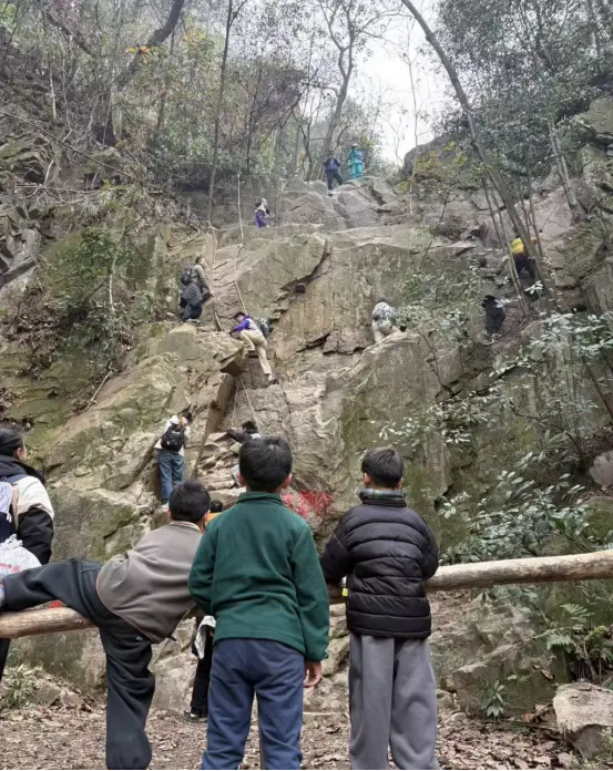 陈洋的另一重担心是,随着户外运动火热,商业性质的亲子徒步活动激增。一位浙江的母亲首次带孩子参与户外商团后,发文指责组织者缺乏安全防护,“为了赚钱,没有底线”。在她的配图中,一队家长和孩子近乎趴着在山体上行进,最窄的地方只容得下一人通过,另一边就是悬崖,“爬到中途,又生气又想哭”。