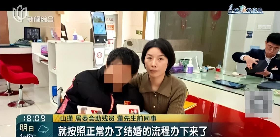 大妹妹则表了态:如果要她接手照顾哥哥,只有一个条件——周女士必须离开这个家,“她只是我哥的女友,不是家人,没资格待在这里”。 周女士其实也清楚自己的尴尬处境。老董第一次抢救时,因为她不是家属,连签字的资格都没有,最后还是医院报了警,才解决了问题。 没人知道,周女士和老董已经在一起十多年了。她之所以不离不弃,只是因为当初刚到上海时,老董帮了她很多,这份恩情,她一直记在心里。 两人迟迟没领证,只因年龄相差23岁,周女士的父母一直不同意。“刚开始他提过结婚,我爸妈坚决反对,现在这么多年过去了,他们也松口了,只让我好好照顾他。” 老董的照护困局,也牵动着属地居委和镇残联的心。居委相关负责人证实了老董的情况,镇残联则表示,已经将老董纳入重点关怀对象,会持续关注他的状况。 居委工作人员坦言,他们也担心老董的情况,也曾想召集老董的家属,一起商量解决照护问题,但最大的难题摆在眼前:两位妹妹不愿意接手,而实际照顾老董的周女士,因为没有法定身份,什么主都做不了。 好在,经过多方反复沟通协调,老董的两位妹妹态度终于松动,同意参与协商。 1月23日,在充分咨询民政部门相关政策、确认两人都是真心意愿后,在居委助残员的陪同下,老董和周女士一起去婚姻登记处,办理了结婚登记。相恋十多年,周女士终于有了名正言顺的身份,也终于能名正言顺地照顾老董。