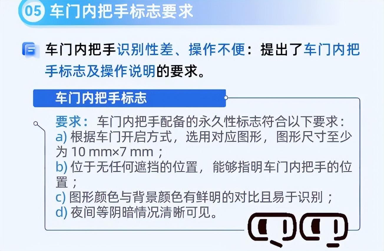 为了车内人员能够在紧急情况下打开车门,《技术要求》对车门内把手标志提出要求要求:根据车门开启方式,选用对应图形,图形尺寸至少为10 mmx7 mm;位于无任何遮挡的位置,能够指明车门内把手的位置;图形颜色与背景颜色有鲜明的对比且易于识别;夜间等阴暗情况清晰可见。同时,车门内把手配备的中文或图示操作说明应在规定的标志附近或车门内把手附近,中文或图示高度不小于6mm等。 工业和信息化部科技司有关负责人表示,汽车车门把手标准,不仅是技术问题、设计问题,更是安全问题。规范隐藏式车门把手,为的是让安全问题不再“隐形”。 在此之前,公安部组织起草的国家标准计划《机动车运行安全技术条件》也于去年11月开始向社会征求意见(以下简称《征求意见稿》)。与2017版标准相比,本次修订更改和新增了多项整车安全装置配备要求,包括对新能源汽车动力电池安全防护、门把手等行业热点问题制定了新的规定。
