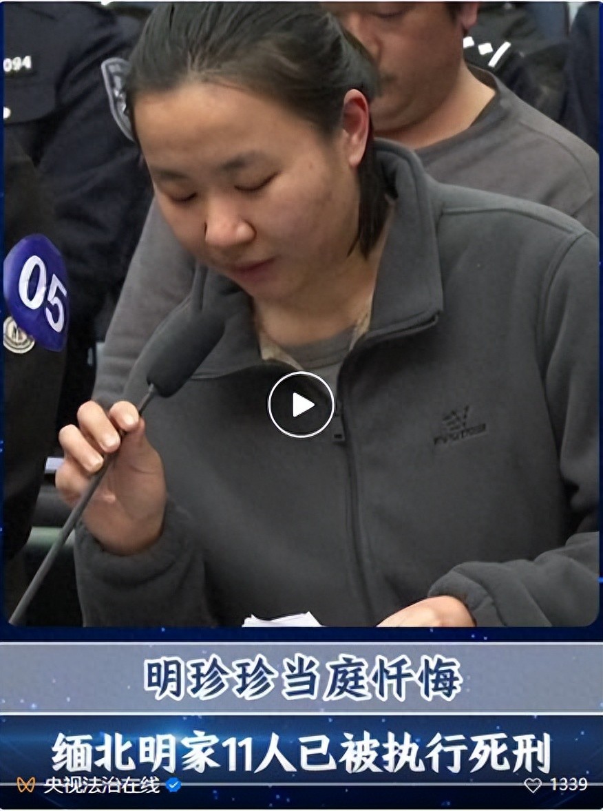 2月8日,@CCTV法治在线 披露明珍珍当庭忏悔视频。 其在法庭上忏悔说道:“造成今天这样的局面,我感到很愧疚,如今我也深刻意识到了自己的错误,为自己以前的无知和愚昧感到懊悔。对不起,我愿意去承担该由我承担的责任。” 此前报道: 11名主犯被执行死刑,回顾缅北明家犯罪集团覆灭始末 1月29日,以明国平、明珍珍等人为首要分子的明家犯罪集团11名罪犯被执行死刑。这个长期盘踞缅北果敢,依托武装力量,大肆对中国境内公民实施电信网络诈骗,残害中国籍涉诈人员性命的犯罪集团彻底覆灭。那么,明家犯罪集团究竟犯下哪些累累罪行,又是如何落入法网的?一起回顾。 在缅北果敢地区,包括明家在内的“四大家族”控制着当地的赌场、矿产、地产等暴利行业和黑灰产业,大肆对我国公民实施犯罪。